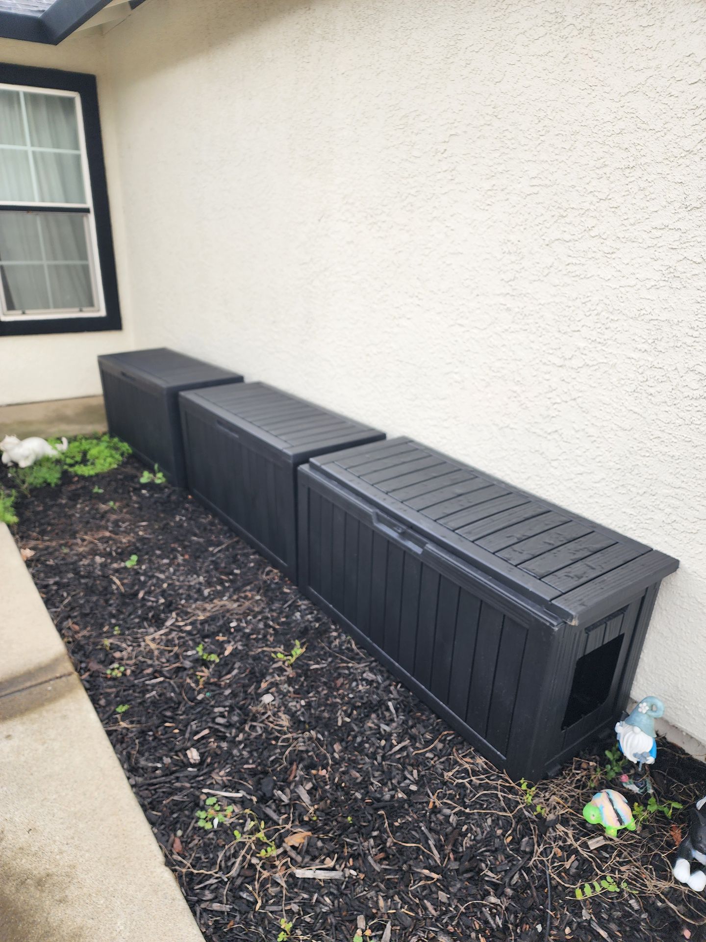 Diy cat box or storage for outside. I also have other cat boxes/mats/animal doors with hinge/pans/etc. 3 large black boxes with door available $35 ea 2 medium white/Grey top door boxes available $20 ea 3 stainless pans $10 ea 5 Mats varying size $5 ea 3 large Dog pan $15 ea Litter genie $10 3 large cat door $10 ea Item bundle discount available!