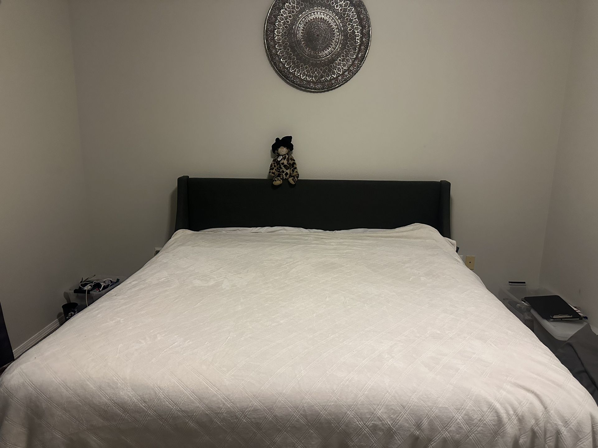 Padded cloth headboard and trim with bamboo plank supports. Padded joints (no squeeking). Pillow top mattress 6 years old. It’s been rotated and in good condition.
