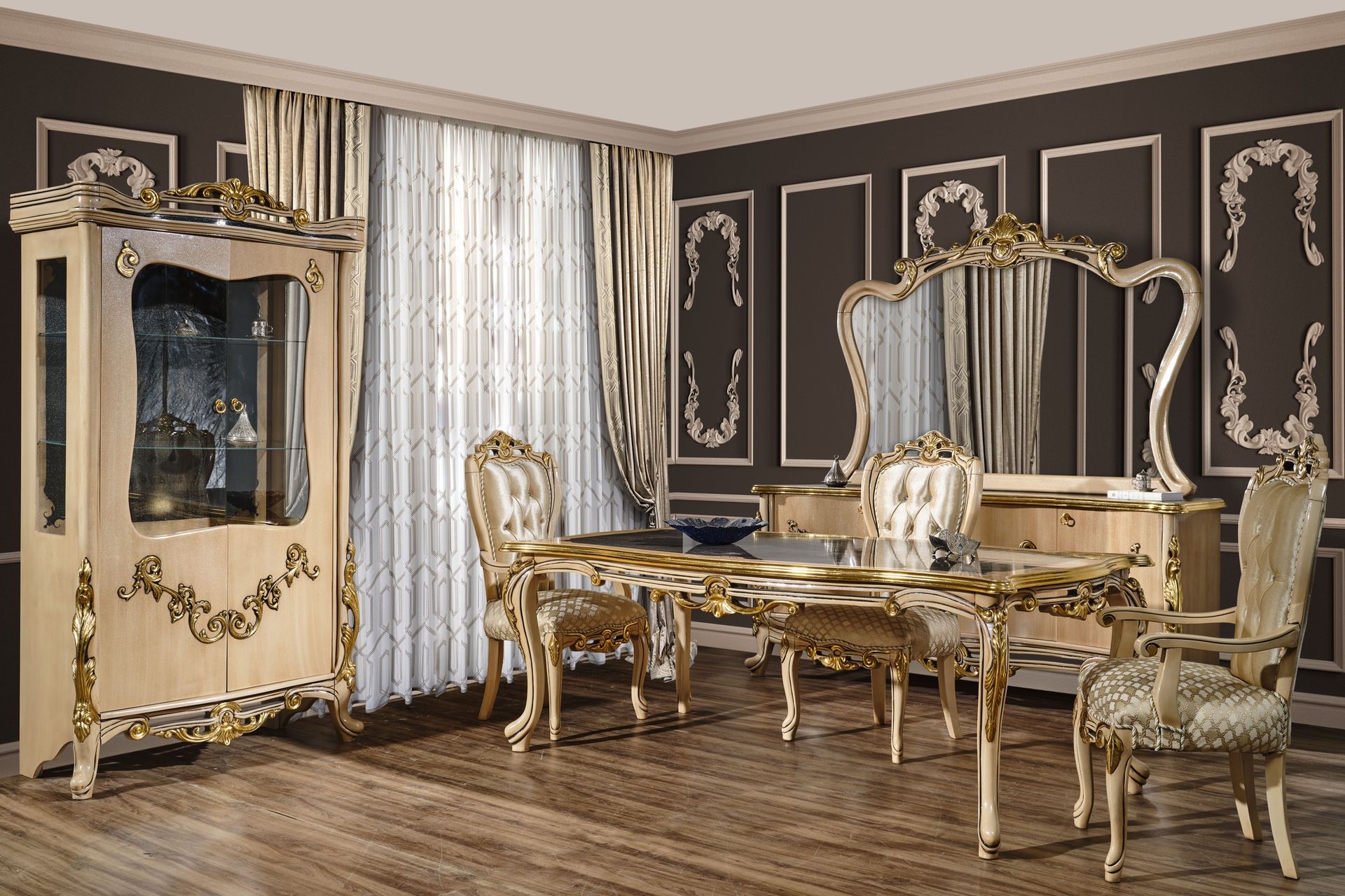 Royal Dinning Set. Made in Europe most unique and elegant made from oak wood. All Hand Made and Hand Engraved by a family owned for 4 generations Set includes 1 Oak wood Dinning Table 6 Dinning Chairs 2 Arm Chairs 1 Luxury China Cabin 1 Breakfront and Matching Mirror 1TV Stand