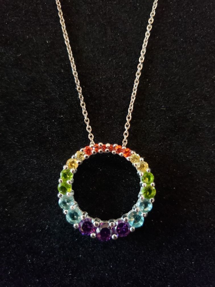 $30. STERLING SILVER Rainbow CZ circle pendant and necklace. Pendant is 3/4 inch diameter. Necklace is 18 inches.