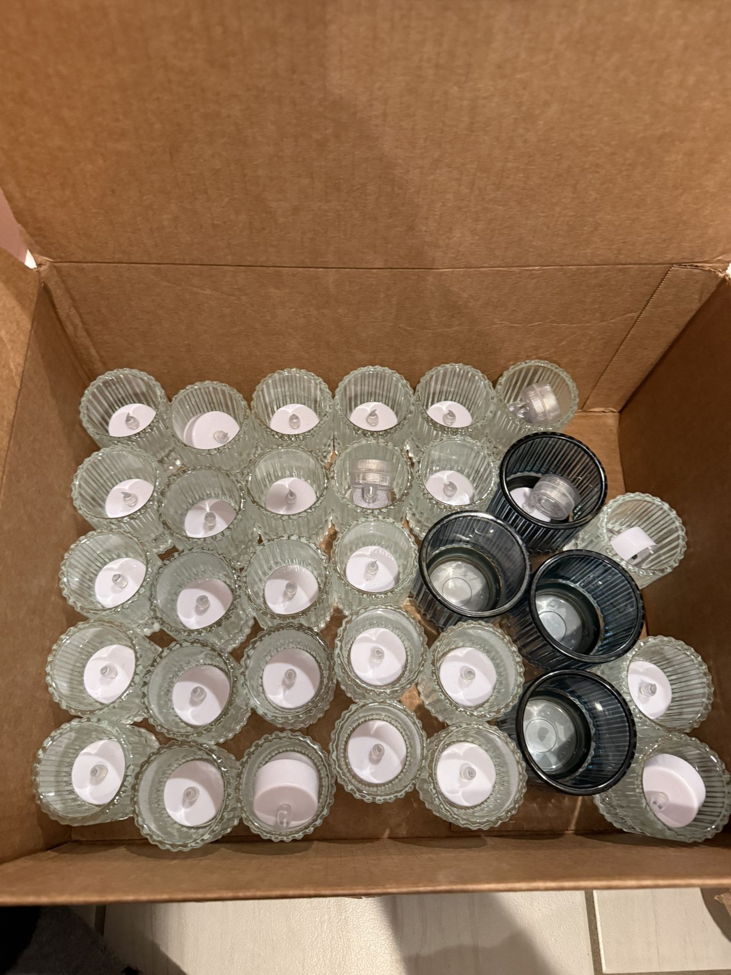 28 white candle holders. 4 larger green candle holders. Battery powered lights included Perfect for weddings or parties.