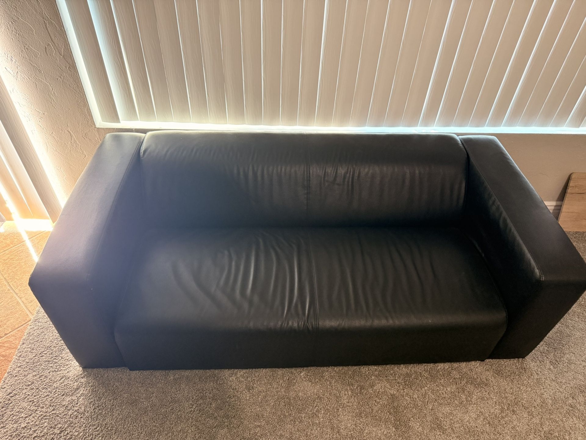 Just as is, leather ikea couch. Only had two small blemishes shown on pictures. Doesn’t have any stand or leg extensions just couch.