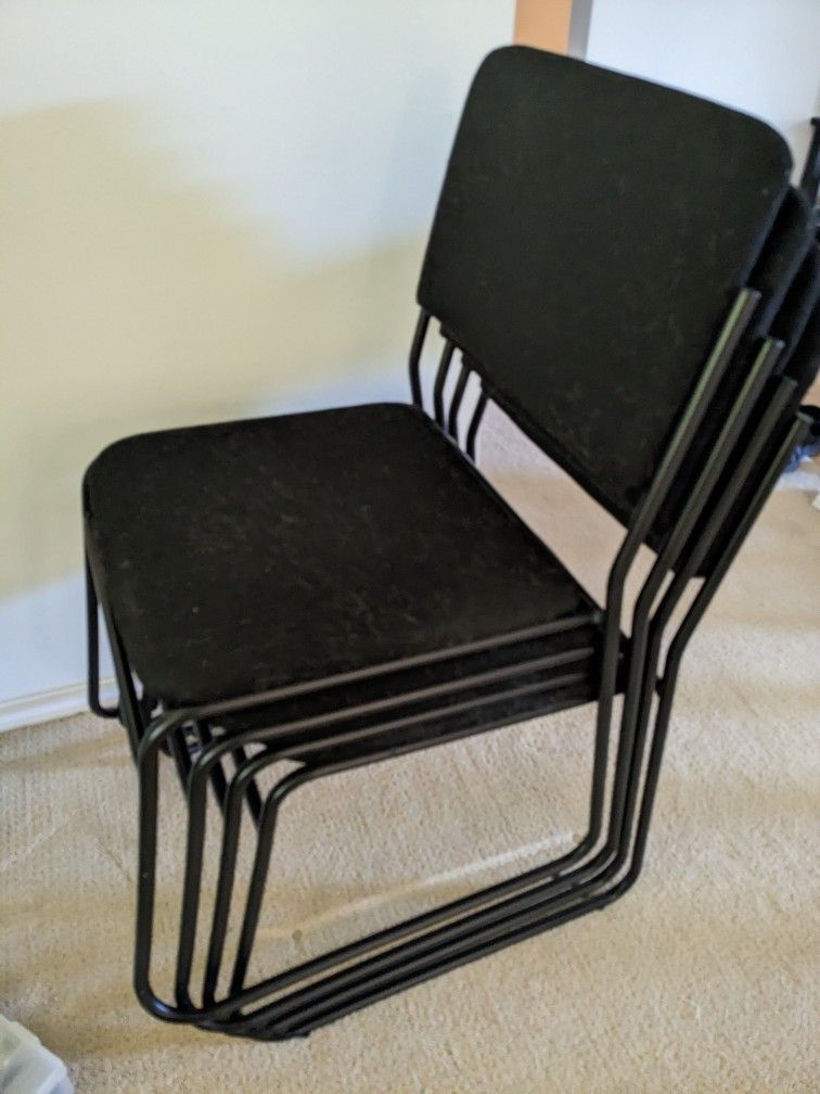 4 black stacking office or desk chairs. Very sturdy. In decent overall condition. However, they have a lot of fuzz and cat hair that I am unable to vacuum off. Asking price is for all 4 chairs