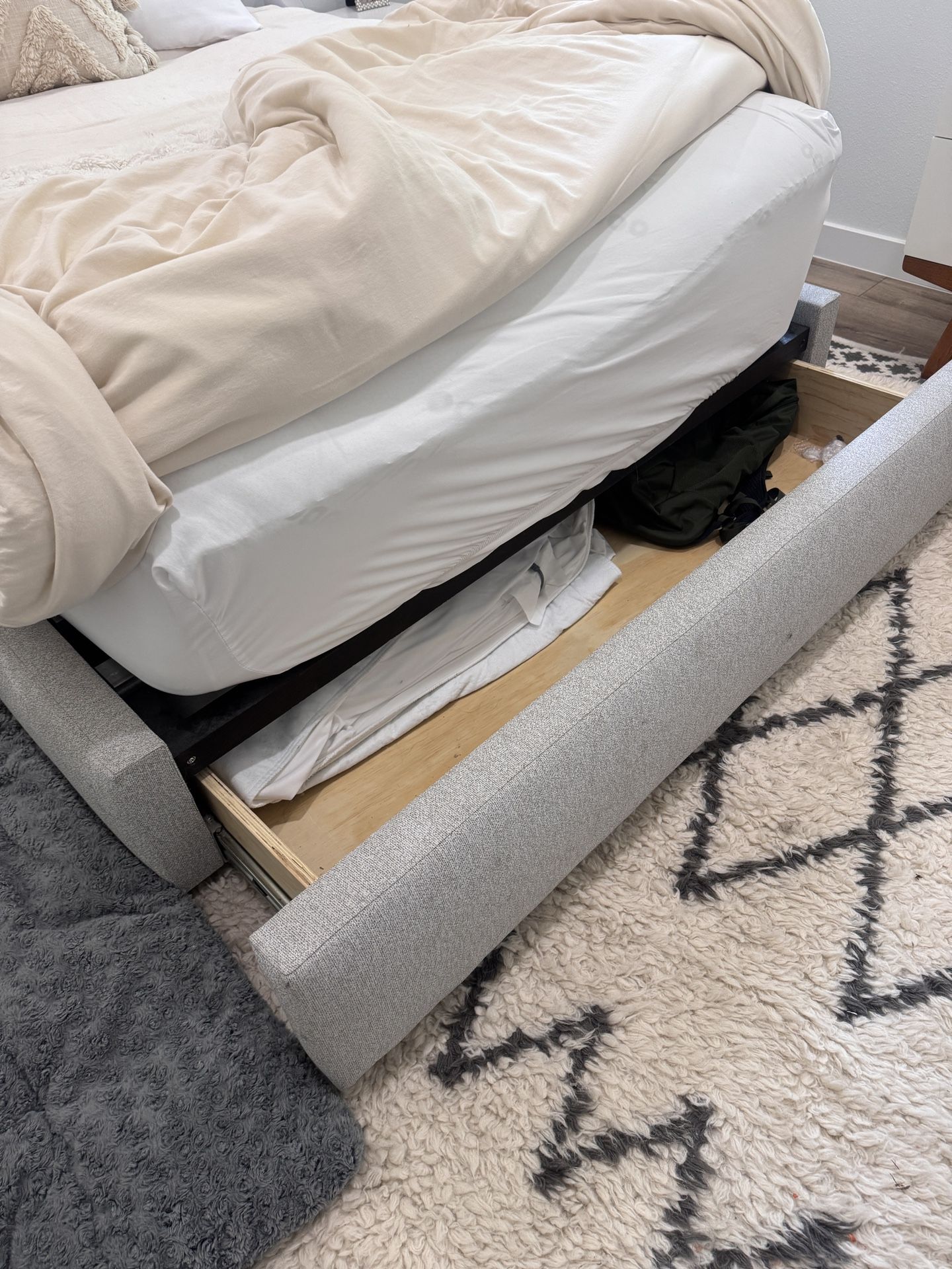 Room and board bed and organic mattress with pull out drawer and fabric lined headrest. I’m moving back to Australia so it’s gotta go!