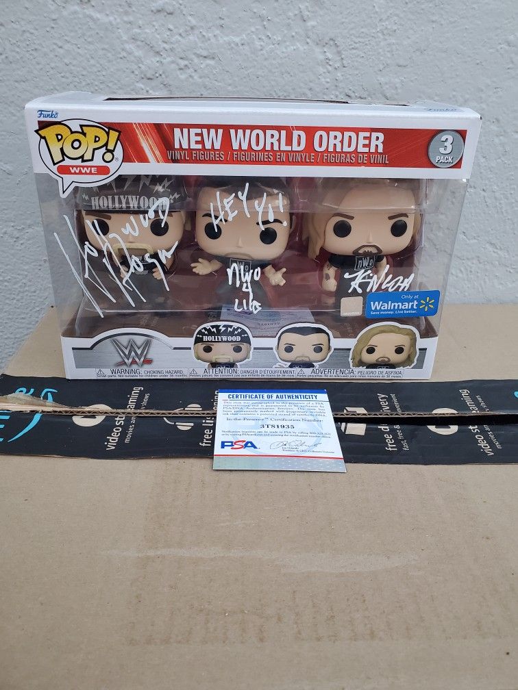 Hulk Hogan And Kevin Nash Signed NWO Funko POP 3 Pack with PSA COA. Item is signed by Hulk Hogan and Kevin Nash. PSA Certificate of Authenticity can be verified through their website. Selling for $500 Or best offer. Message me if interested or have any questions about the item.