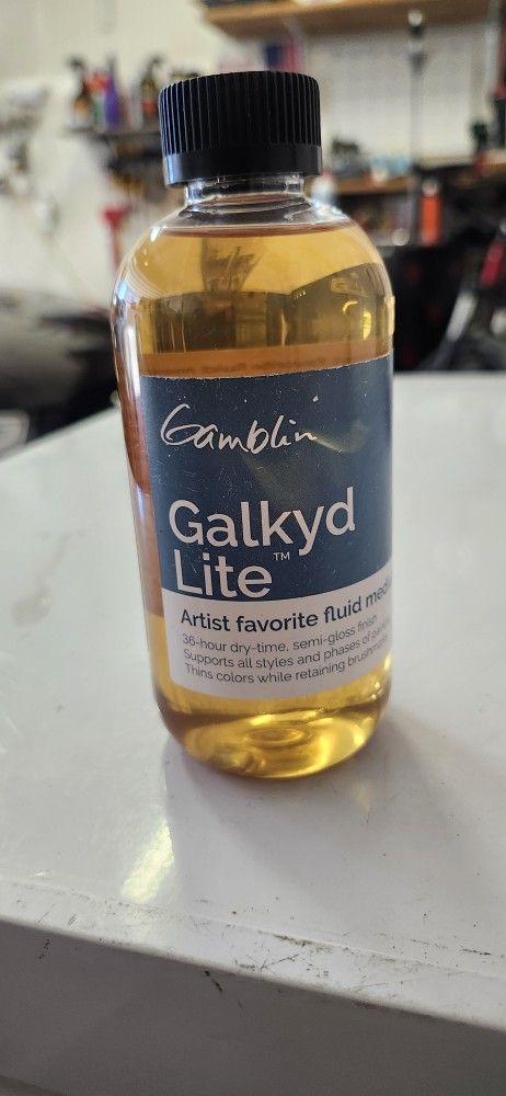 Have 7 new bottles if you get more than 2 will do bulk deal. Galkyd Lite (Low Viscosity) is an alkyd resin medium with a low viscosity that is very similar to a traditional dammar/refined linseed oil/turpentine painting medium. Glazes made with Galkyd Lite look less glossy than those made with traditional mediums or Galkyd. Galkyd Lite is perfect for painters who prefer a lighter painting medium or want a longer working time. Thin layers are ready to paint over within 24 hours. Thins with Gamsol.