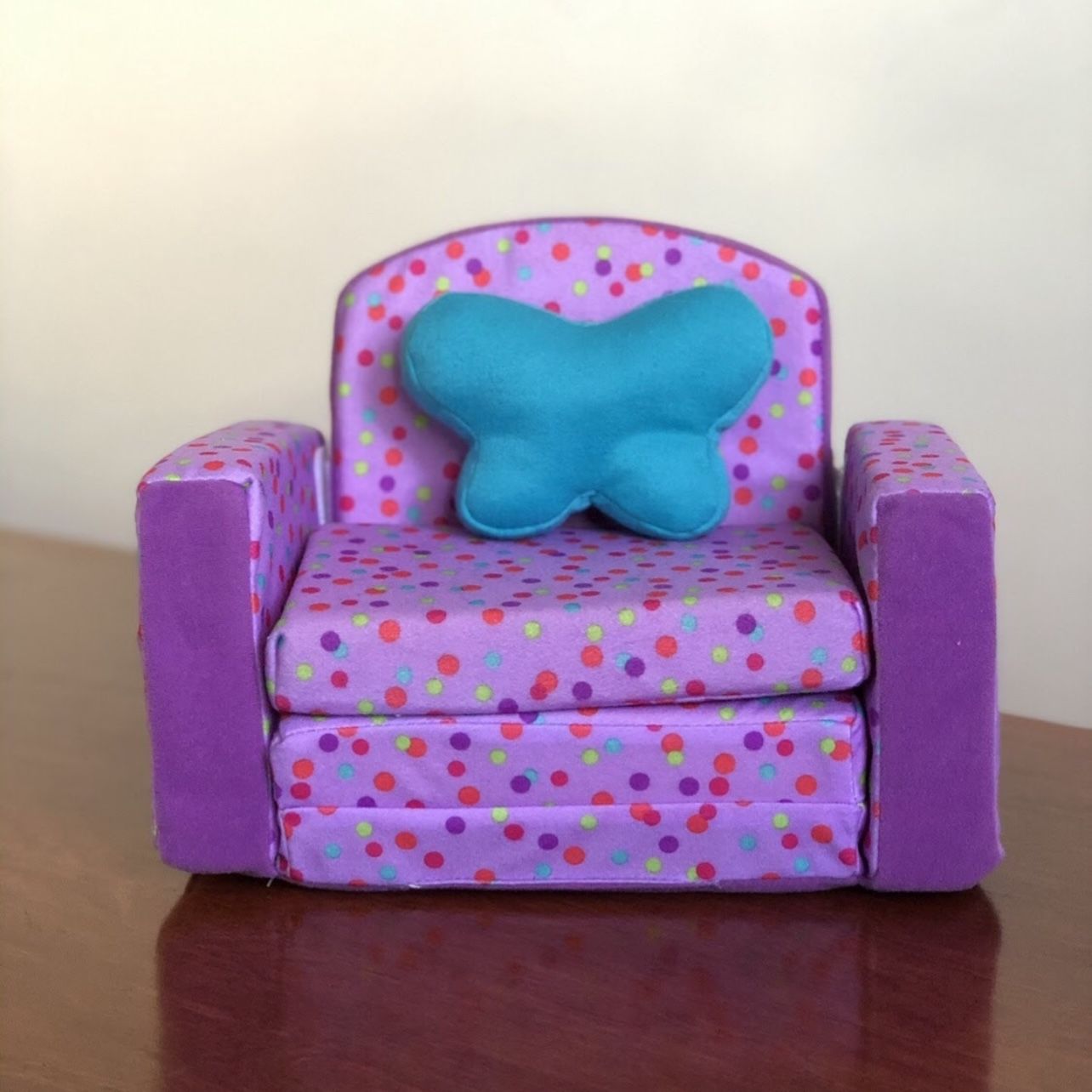 Sofa bed, purple color with colored dots. Ideal for the size of an American Girl Doll.