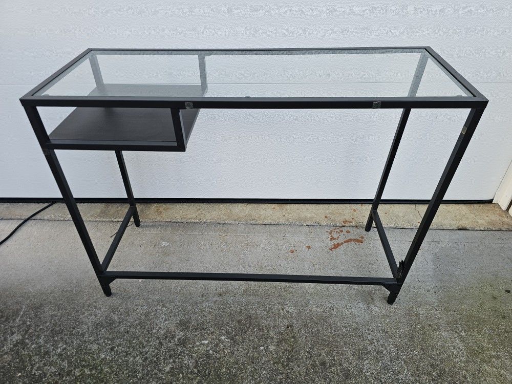 Nice little desk or entry table. It is more of a desk, but I think it could work as an entry type table as well since it is fairly narrow. Glass top and a small shelf on the right side (I accidentally took the photos with the desk turned around so it appears to be in the left). 14in deep 29in tall 39.5in long