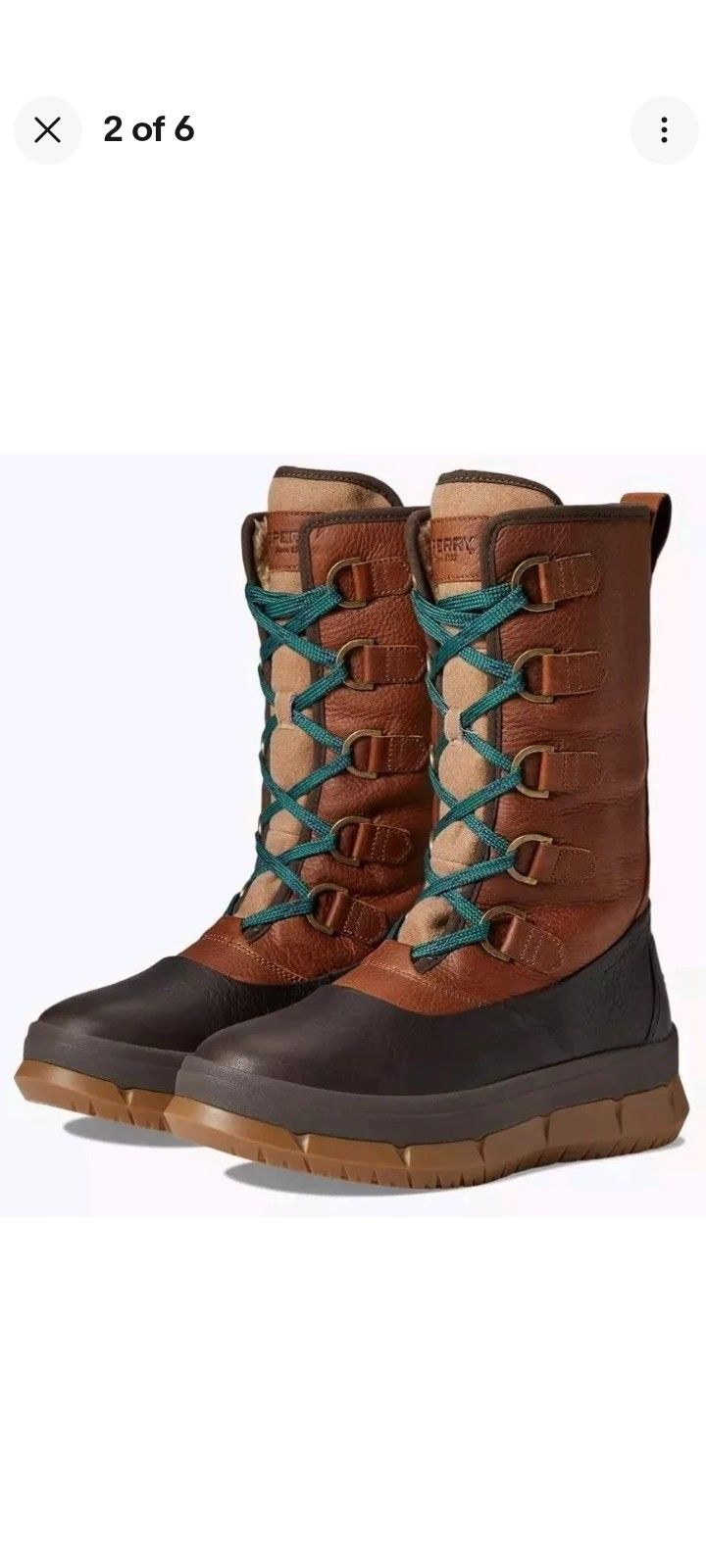 Sperry Top-Sider Kittery Waterproof Leather Mid Boot 7 US Women's Premium leather upper, rich pebbled pattern, soft buttery feel, tan, brown and teal hues, lace-up closure with D-ring easy lacing hardware, insulated, wool textile lining and removable insole, mid-calf length, pull tab on the back, signature logo and signature embossing, almond toe, signature traction rubber sole. New without Box!