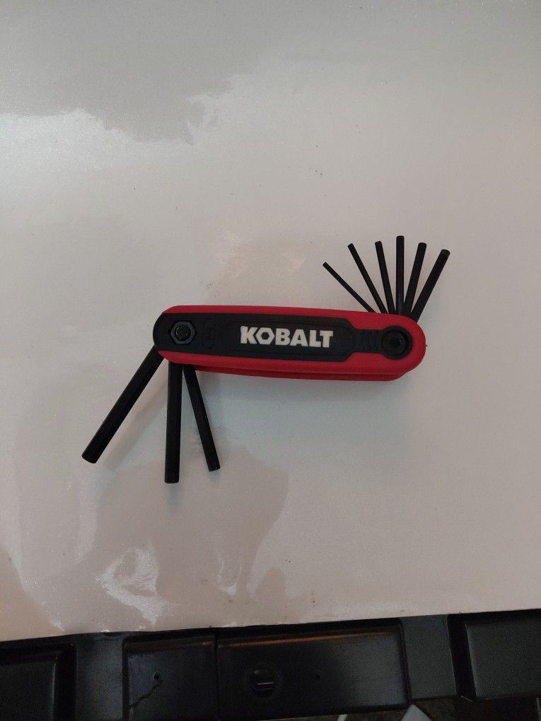 Kobalt Folding Assorted Standard (SAE) 9-Piece Hex Key Set. This set includes common SAE hex key sizes: 5/64, 3/32, 7/64, 1/8, 9/64, 5/32, 3/16, 7/32, and 1/4 inch. It features a textured body overlaid with rubber for a steady grip and comfortable use. The convenient folding design protects the tools when not in use and offers easy storage.