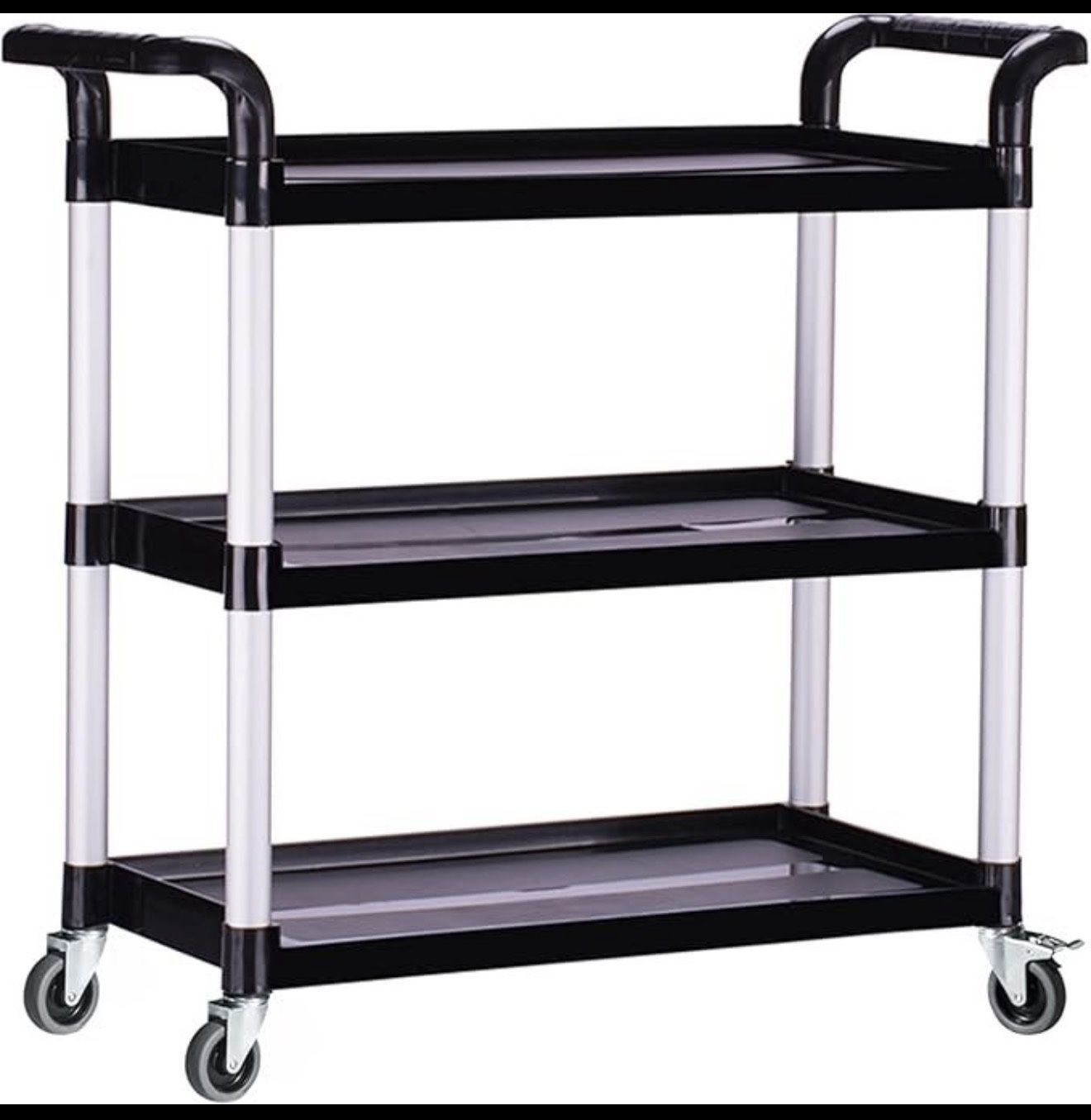 PLASTIC UTILITY CART - At 31.5" long and 16.9" wide, The tray size is: 24.5"L x 15.5"W. This is one of the most durable utility carts on the market. With its three spacious shelves, this cart provides ample space for catering equipment, boxes, tools, and more - the possibilities are endless! This rolling carts with wheels can support up to 510 pounds. Each layer bears 170 lbs. The cart is lightweight but durable, aluminum uprights and the polypropylene plastic shelves are resistant to scratches, dents, chips and rust, so your cart will always look brand new! Item Condition • New, open-box item.