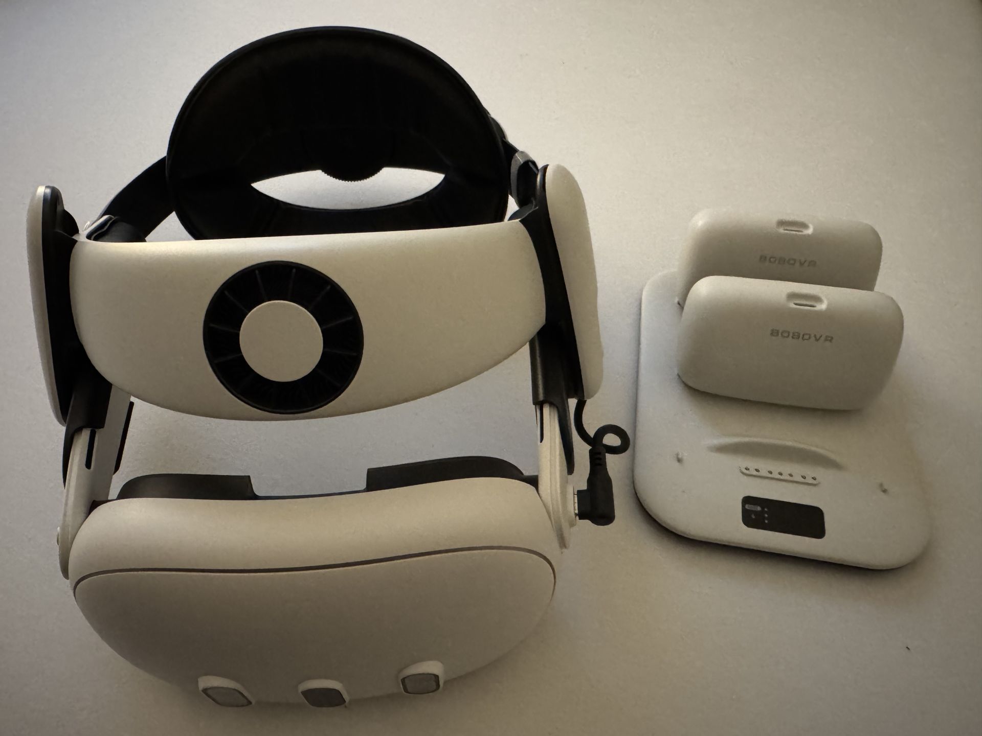 Like new. Comes with: BoboVR S3 Pro head strap 2 10,000mah batteries Multi battery fast charger Original controllers Original box