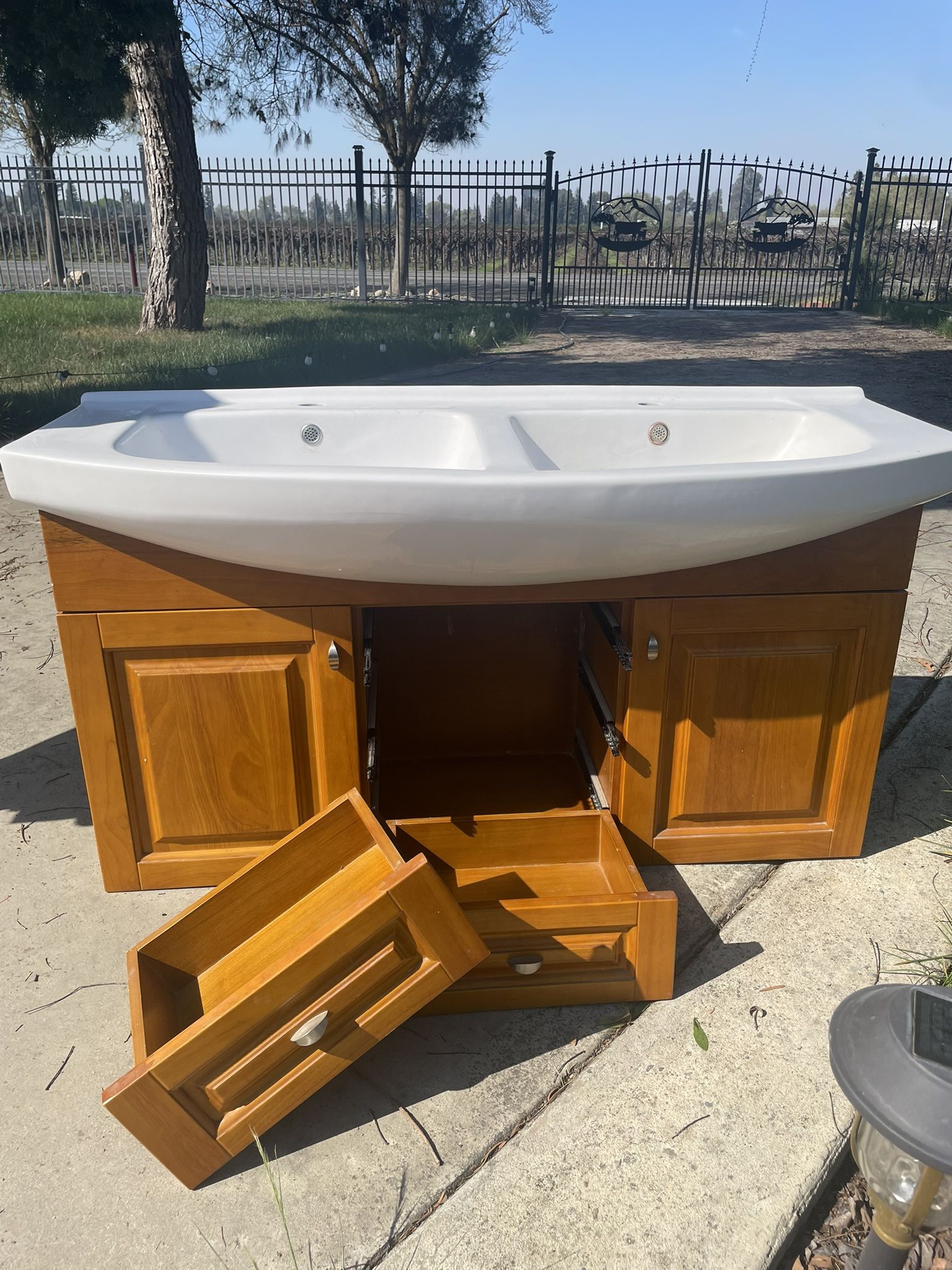 36” bathroom vanity wit two sinks. The vanity is solid wood with two sinks.