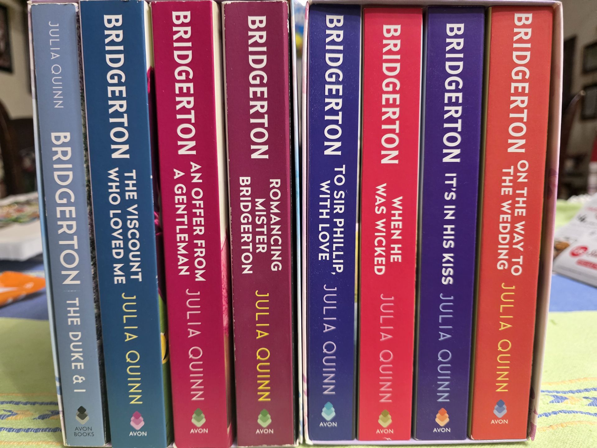 Books 1-8 in the Bridgerton series. Paperback. Books 1-4 like new, read through once. Books 5-8 brand new never opened.