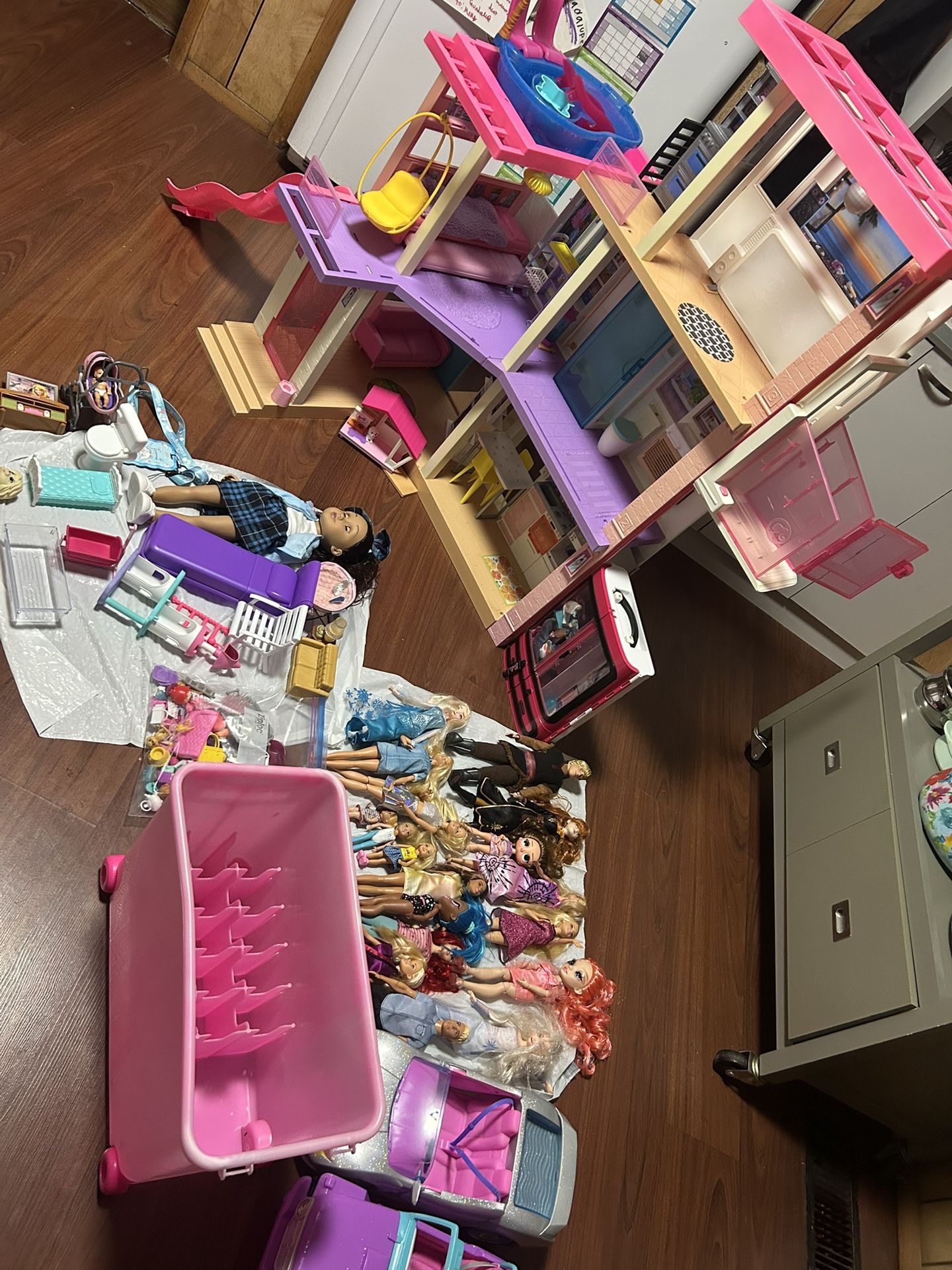 My 12 year old no longer plays with it . Had it for a year and a half. Good condition. Was covered in a bed sheet since July/august . Includes Barbie’s, accessories, cars, camper, Barbie organizer for storage and everything you see in the pictures is included. Needs to go this week
