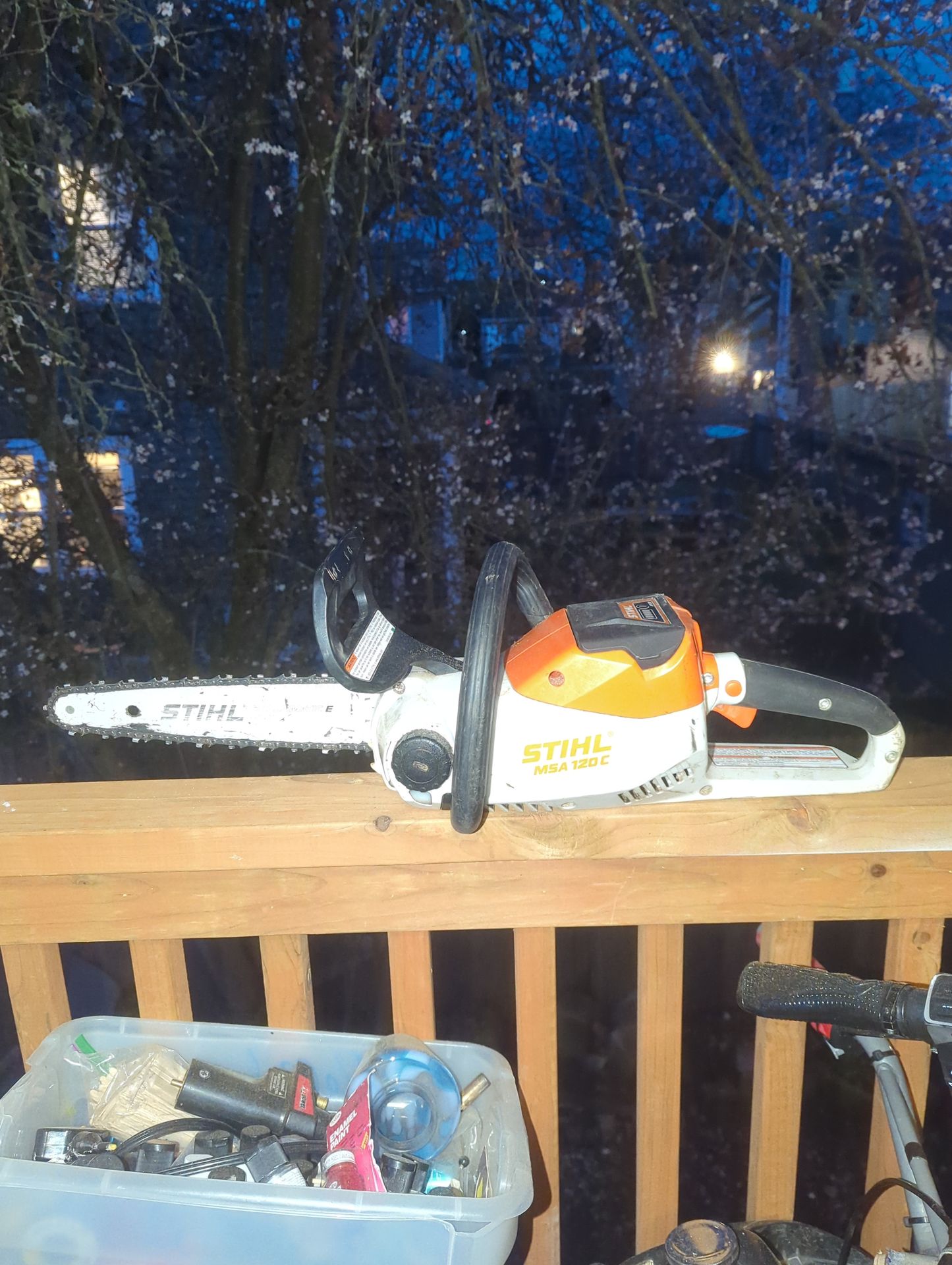 Battery operated Stihl Chainsaw used only a couple times while camping to cut up some firewood. Chain is new and still very sharp cuts right thru wood with ease. Sells brand new for around $300 asking$175 obo. Also open to trades lemme know what ya got worst I can say is no