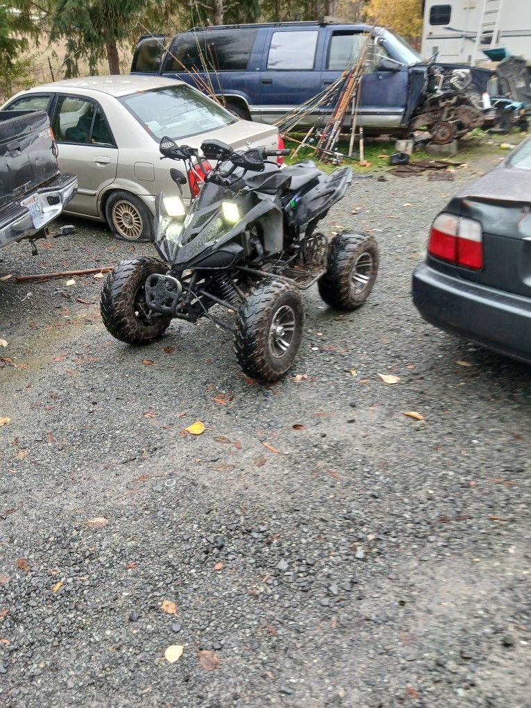 The ninja quad is for sale or trade for other fast cool ATVs or motorcycles or hell even cars this thing is a Chinese coolster 150 ATV Frame and Body with a Kawasaki Ninja 300EX street bike engine swapped onto it it runs and rides it's a lot of fun needs a little work here and there it's a bit of a Frankenstein Project but as is you can fire it up and ride it it's got all brand new brakes front and rear it's got a engine with about 7,500 Mi on it just change the oil in the brakes it's ready to go I've had my fun with it now I'm looking for something else to play with hit me up with your offers I have stated above looking for trades but looking for 1000 firm Cash Wise