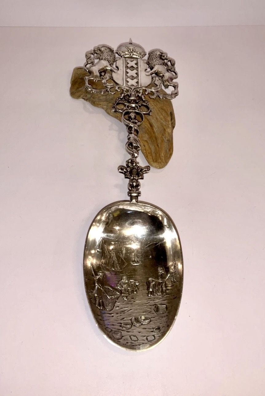 Offered for sale is a large antique Dutch solid silver souvenir / serving spoon, beautifully detailed and marked “HOLLAND” with a Dutch lion hallmark (Dutch silver standard, commonly .833). This is an impressive, oversized piece with strong decorative and collector appeal. Key Details • Origin: Netherlands (Dutch) • Material: Solid Dutch silver (lion hallmark; commonly .833 standard) • Marking: “HOLLAND” stamped in the bowl + Dutch hallmark (see photos) • Weight: 203 grams (shown on scale) • Length: approx. 13 inches (see measuring photo) • Design: Ornate heraldic finial featuring Amsterdam coat of arms (shield with three X’s) supported by lions and topped with a crown • Bowl: Detailed raised / engraved scenic scene (figures, boats, shoreline / harbor activity) Condition Good antique condition with age-appropriate wear. Shows surface scratches, patina, and natural tarnish consistent with age. No breaks or repairs noted. Please review all photos closely as they are part of the description. This is a substantial, heavy Dutch silver piece—excellent for collectors of Dutch silver, Amsterdam memorabilia, or ornate antique serving pieces.