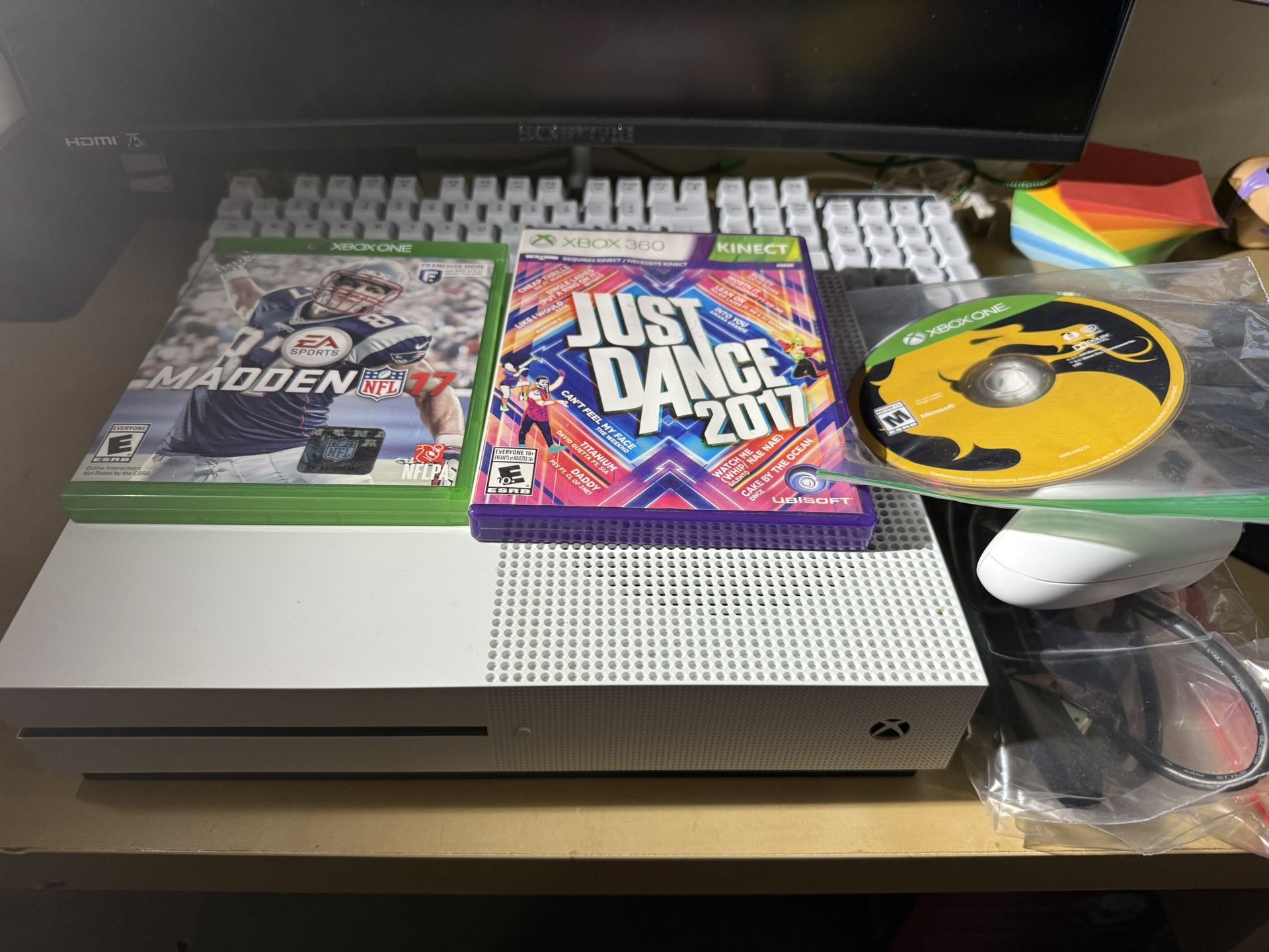 Good condition 1TB Xbox one S, comes with everything plus, Mortal Kombat 11, Just dance 2017, and madden 17. Everything works perfect was used in a smoke free house. Message for more questions/ pictures. Pickup only.