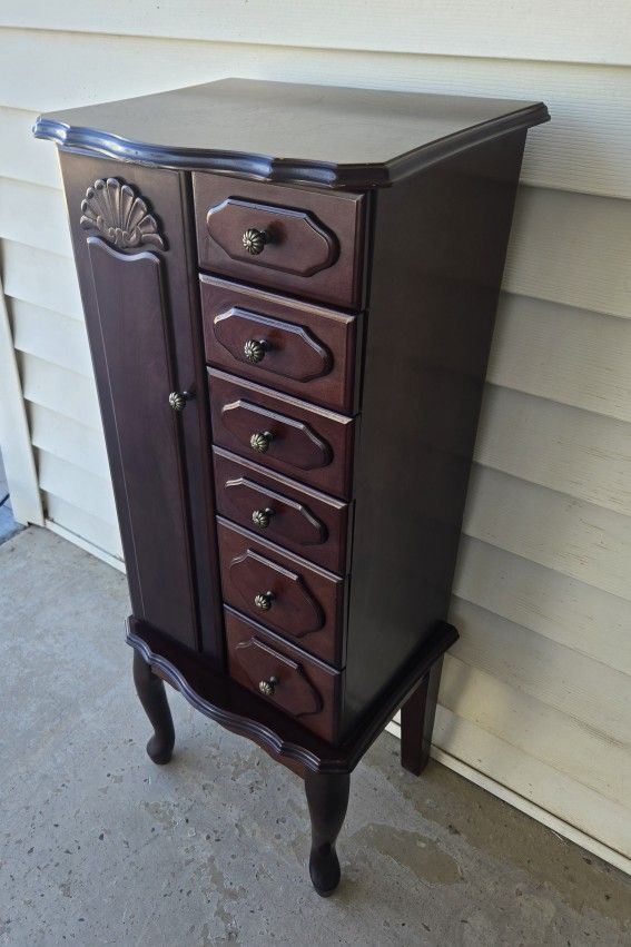 Jewelry Cabinet Armoire, Mirror, Drawers, Cabinet Tons of space to put jewelry and other things in. Top area for rings, Mirrored Lid, 6 Drawers, Inside door for necklaces and large cabinet area Measures 16 x 13 x 40" tall In like new condition, it really looks like a new piece Message with any questions Items sell very quickly I do not hold items, first come, first serve.