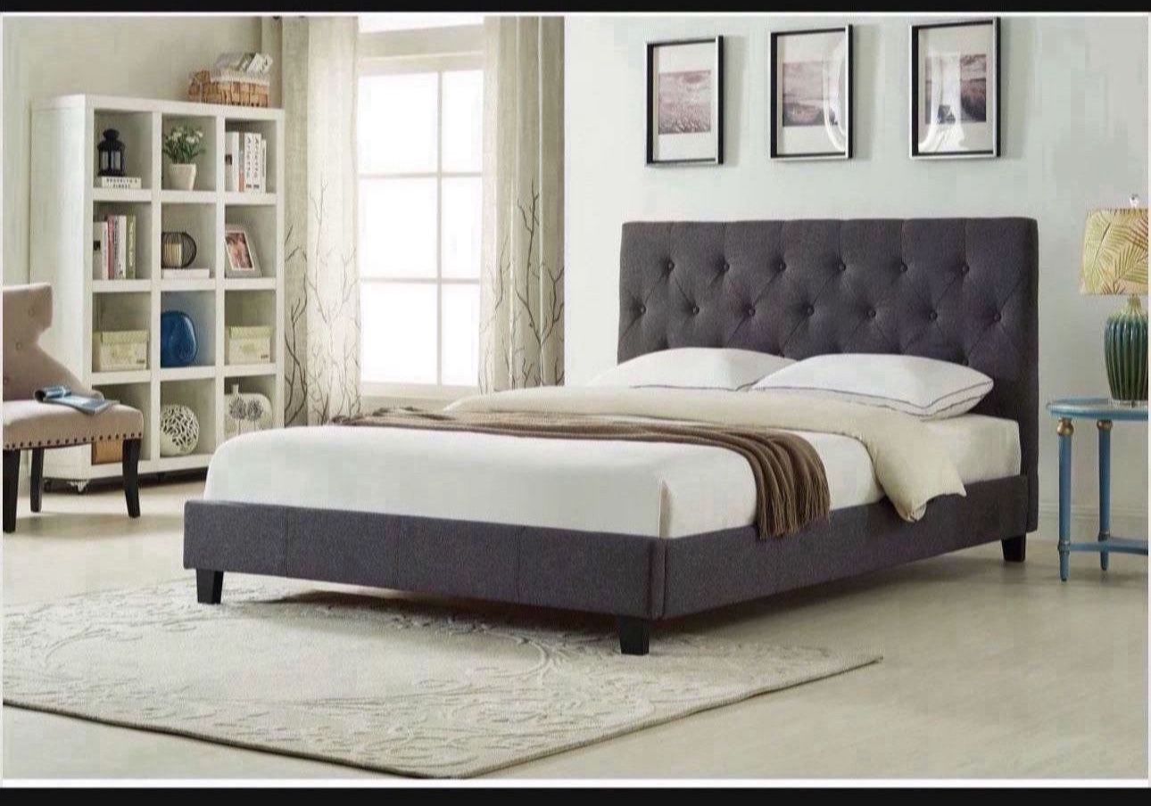 Brand New In Box Queen Size Dark Grey Linen Upholstered Bed With Mattress. Assembly Required (the bed comes in boxes And you have to put it together) 63.4"W x 86.2"D x 43"H Pillows and blankets not included We can deliver Se habla español