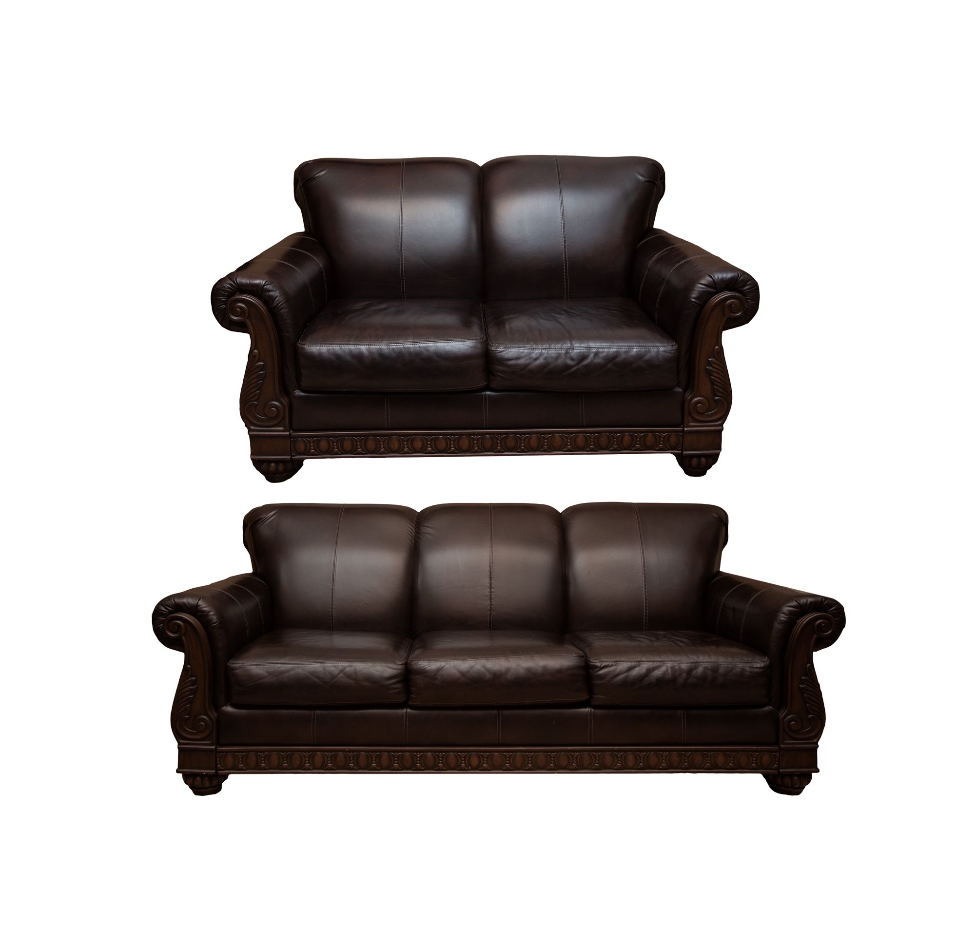 Dark brown leather sofa and loveseat. In good condition few scratches and nicks throughout very comfortable. Measurement of sofa: 79W x 37 H x 35d measurements of loveseat: 56W x 37 H x 35d
