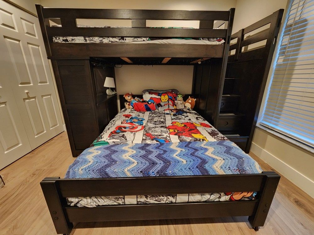 Excellent condition bunk bed / desk combo. Twin bed on the top, mattress in excellent condition. Full bed on bottom, again excellent condition. Both mattresses weren't used much. No stains. Full bed rolls out for easy cleaning. Dimensions are in the photos. Pretty firm on the price and will consider serious offers only.