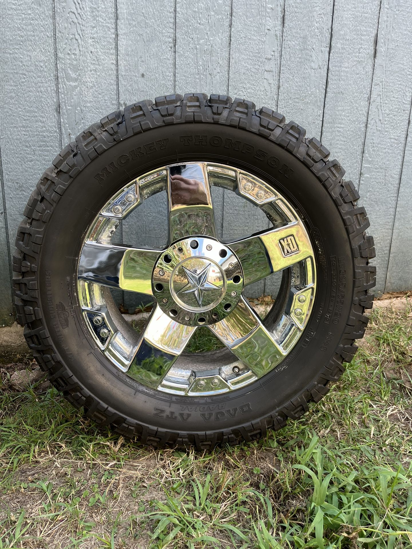 20” chrome, rockstars with all 4 center caps 3 Mickey Thompson tires and one Dick Cepek size 305/55/20 chrome ok No crack or damage or crub rash on rims 8 lug from a 04 Ford F-250