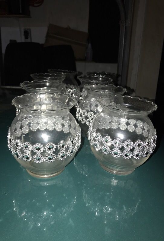 Eight centerpieces, small vases decorated with rhinestones.