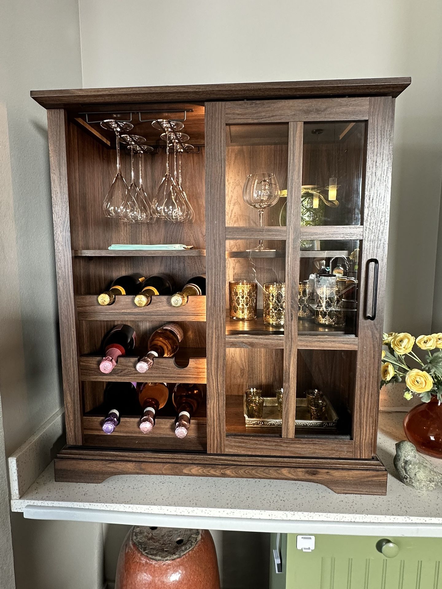Beautiful warm wood cabinet with custom-installed lights. Sliding door. 36” h x 31.5”w x 15.5” deep. Wine and glasses not included!