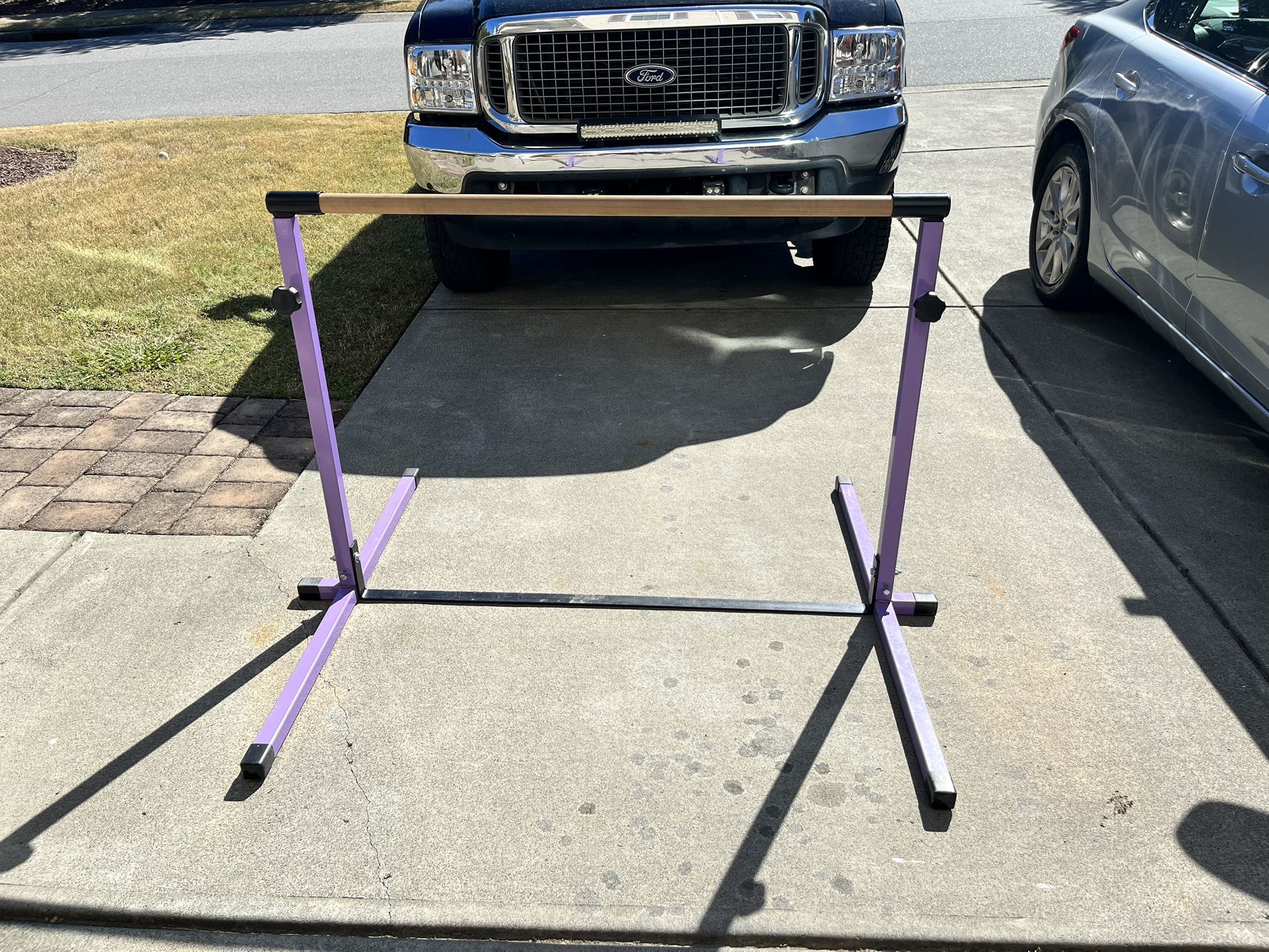 Simple, sturdy kip bar. Adjusts 3 ft to 6ft In height. Nice base, can be taken apart for transport. Asking $100 obo