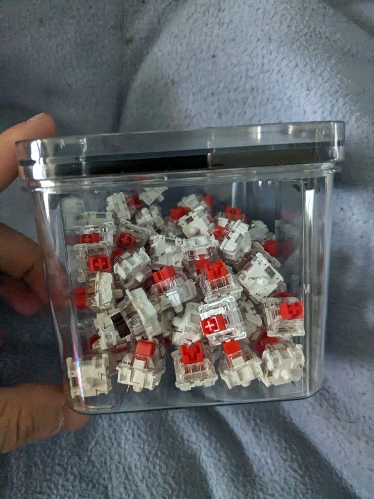 90 + count of OUTEMU switches for an outemu keyboard only, comes with the container. Keys are clicky and mildly loud, and they haven't been used as I bought other switches and swapped them out.