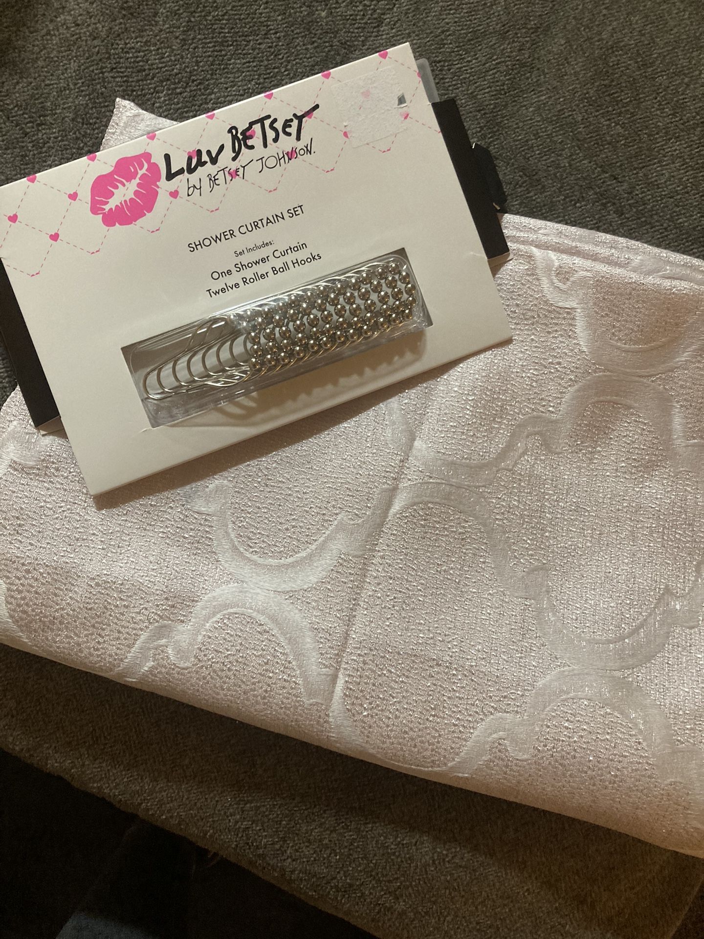 Light pink colored sparkly shower curtain. New it’s only been hung up for a few mins but it didn’t match my decor. I took pics with and without a flash. Color is closer to the picture with the flash. It’s just a really light pink with silver sparkles.