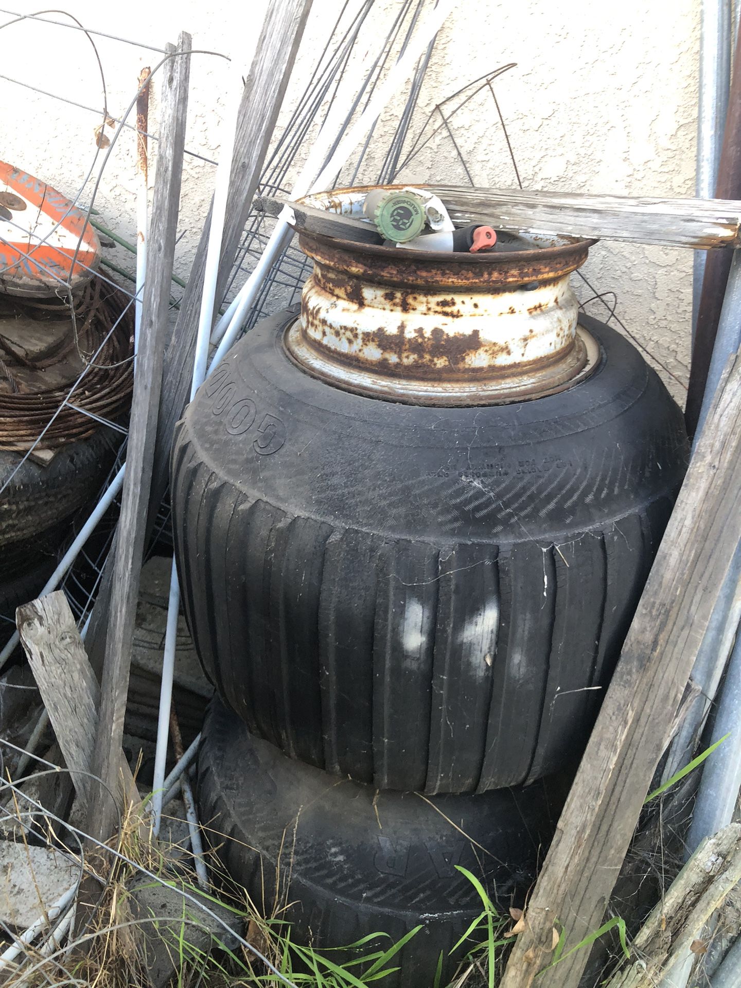 Made by Goodyear about 2 foot wide. About 2 1/2 feet diameter. Rims are welded to conventional rims. Conventional rims appear to be a five on three bolt pattern. These are a matching pair.