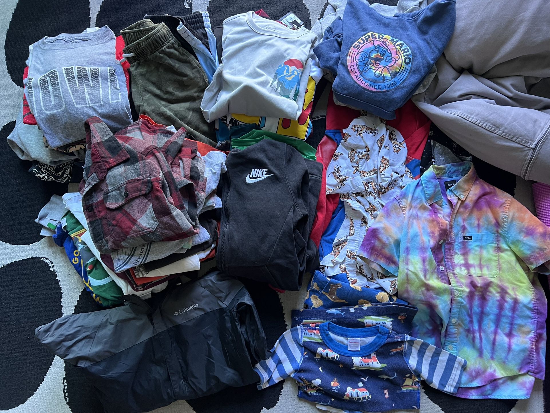 Huge lot of boys clothing. Mostly tops, mostly size medium/8 but a couple small and larges included as well. Includes 2 pairs of Hanna Andersson pajama shorts/tops (pirates and bunnies). 2nd photo includes all brand new items with tags which is 13 items, Mario cosplay hoodie, pullovers and zip ups, button downs, Columbia jacket, 2 pairs of pants, tons of tahirts: gap, Harry Potter, under Armour, Pokémon, video games, Christmas, Smokey bear, target brands and more. Total of 80 pieces.