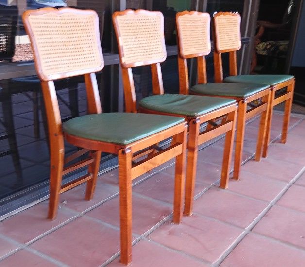 Seat of 4 vintage solid wood wicker back folding chairs by Stakmore furniture company all fold smooth nothing broken minor chipping normal wear good condition $60 total for the ser