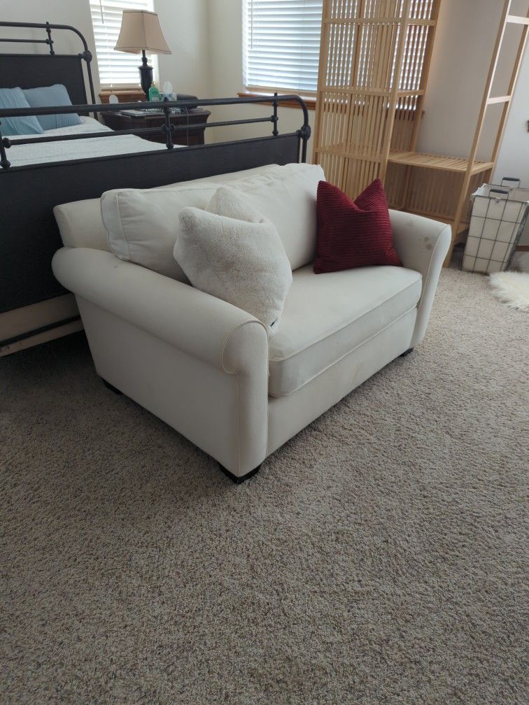 Isabelle Kirk from pottery barn. There are some stains on the arm rest (left side) see photos. It could use a good steam. Or get a slip cover to extend the life of this beautiful comfortable piece of furniture.