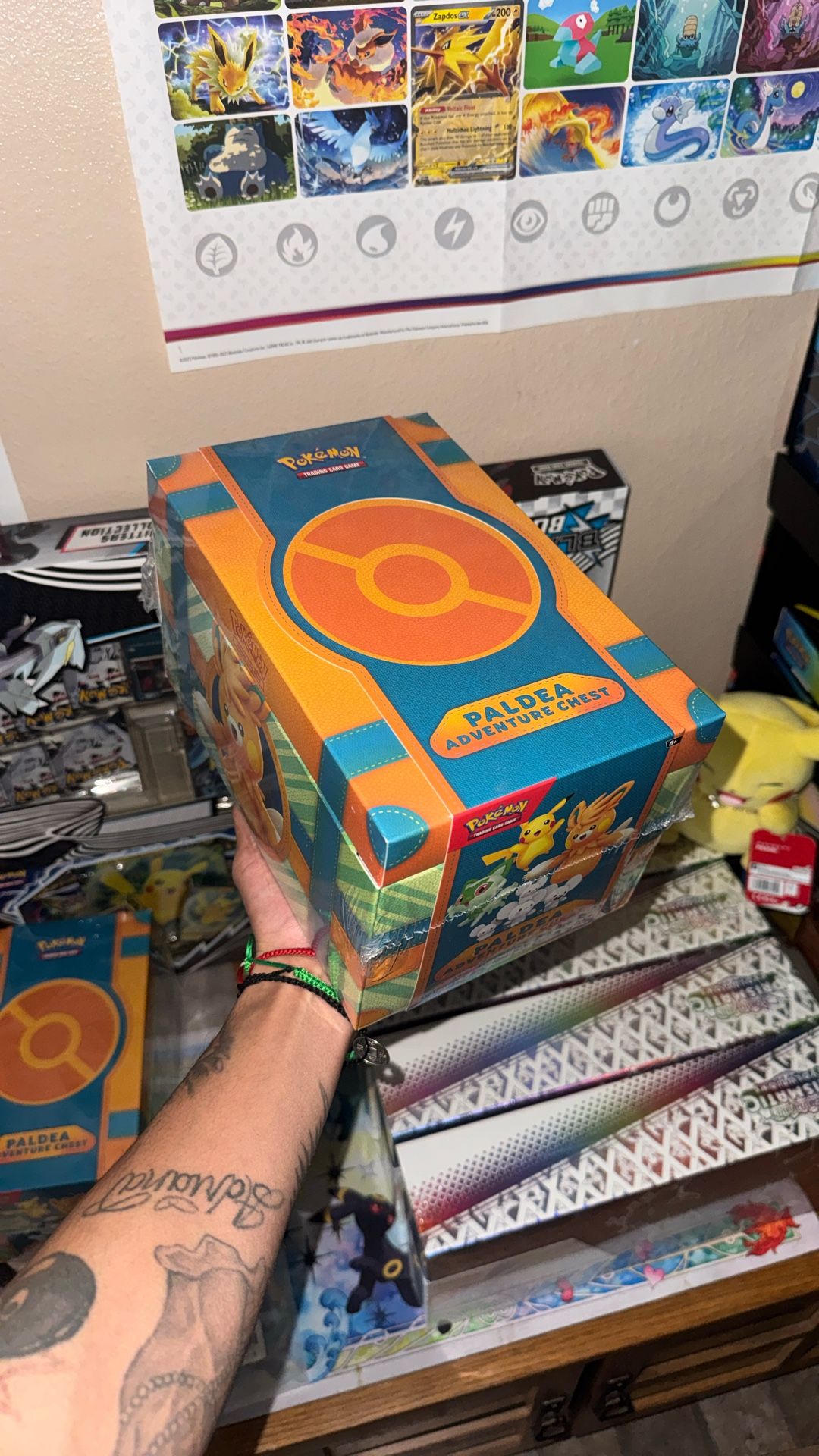 Brand new factory sealed Pokemon product ! Paldea adventure chest comes with 7 foil promo cards , 1 sheet of tech stickers , 1 mini portfolio , 1 squishy pikachu toy , 6 booster packs ! Very limited only 2 available first come first serve check out my page for more Pokemon product !
