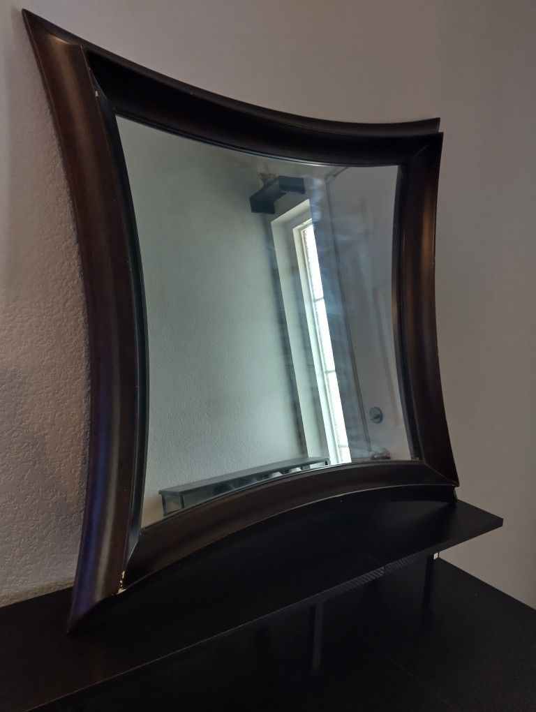 Dark brown medium sized mirror in decent condition has a couple small chips on the wood