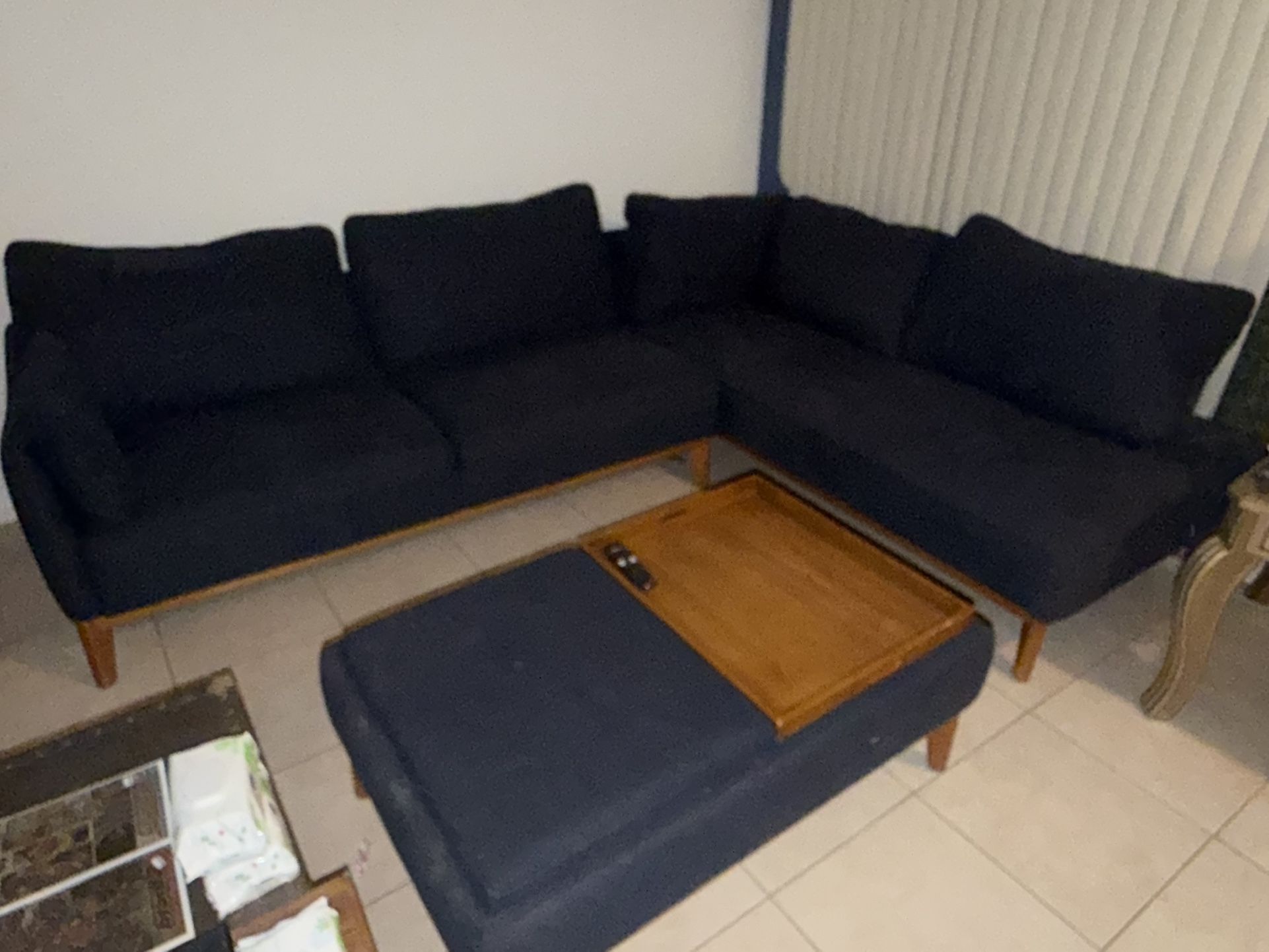Modern L-Shaped Sectional Sofa with Ottoman – Navy Blue Stylish and comfortable L-shaped sectional sofa upholstered in a deep navy blue fabric. Features a low-profile modern design with clean lines and solid wood legs. Includes a matching oversized ottoman that can be used as a footrest, extra seating, or a coffee table (tray shown for reference). The cushions are plush and supportive, making it great for lounging, movie nights, or hosting guests. The sectional layout fits nicely in living rooms, apartments, or open-concept spaces. Details: • L-shaped sectional configuration • Matching ottoman included • Navy blue fabric upholstery • Solid wood legs • Comfortable, deep seating • Good pre-owned condition with normal wear from use A great statement piece that’s both functional and stylish.