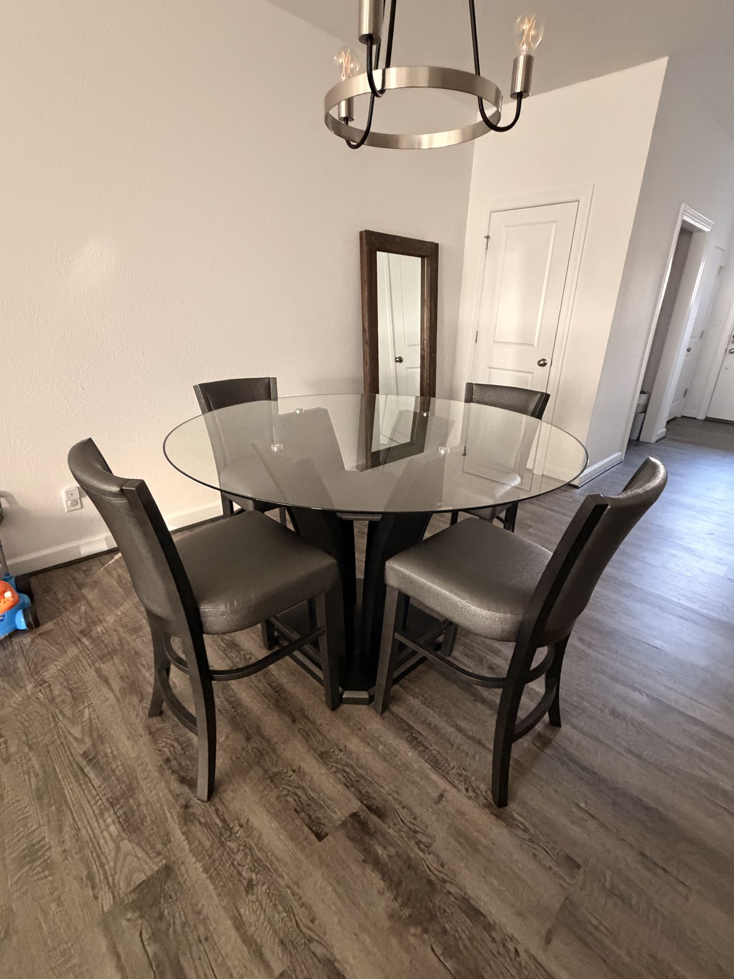 Redoing our house due after a renovation. This table was rarely used as we used our kitchen counter bar. 4 mos old but in immaculate condition, only dusted and wiped down. It's a beautiful set we ordered to fill the space but doesn't match our new furniture coming. It's a sturdy dining set that we are selling as a whole. The table has black trim and has smoke gray colored seats. The table sits up kind of high, it's not low or a standard height. It's very modern chic looking. We paid $990 for this set and am only selling this table as a whole for $500 OBO. Pickup in Chesapeake near S Military Hwy and Indian River from a Non-Smoking home. Serious Inquiries Only Please! Thanks!