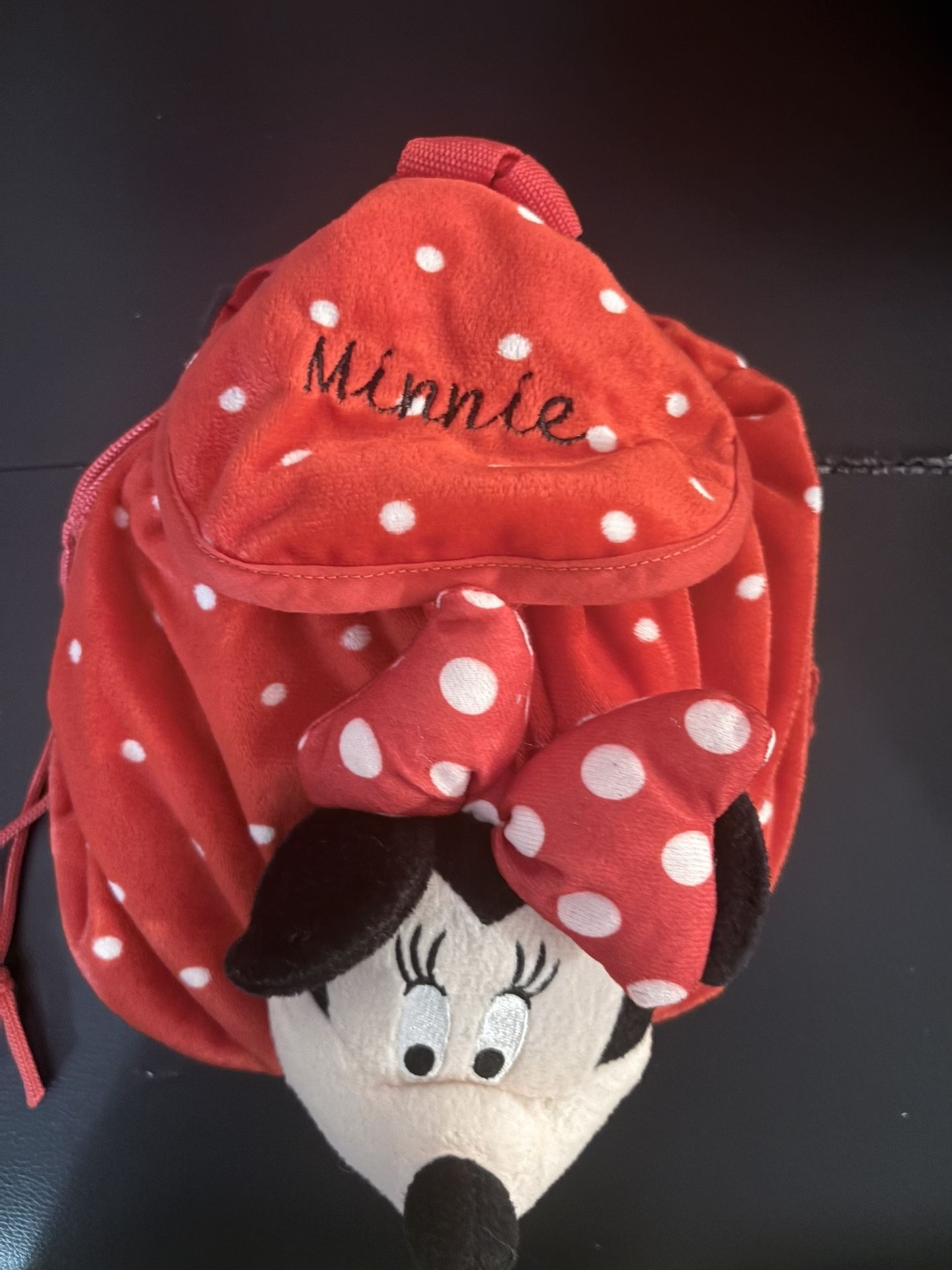 This cute Minnie Mouse backpack is red with white polka dots. It features a plush Minnie Mouse face and a bow. The material is soft and fuzzy. It's perfect for little ones!