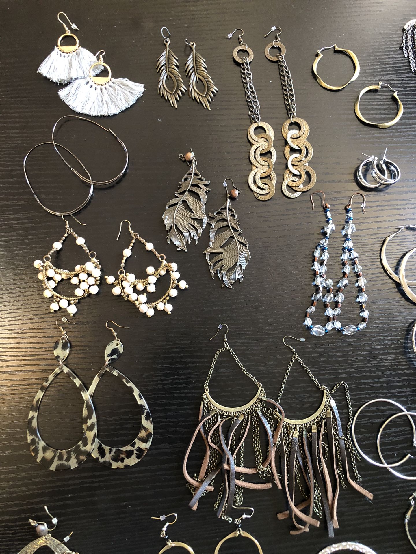 **** READ ALL **** Between $5 and $10 (maybe $3) Near Roosevelt and kedzie I made a lot of these earrings This is over 40 pr. I have more. * Some stainless * Gun metal color * Silver tone * Gold tone * Turquoise * Blue * Black * Crosses * Leather * Costume jewelry * Bohemian * Animal print * Asian * African * Chains If the metal hasn’t turned all these years, it’s not likely to Chicago, or Oakbrook area. If you want me to bring them with me, let me know. Describe the pair you want.