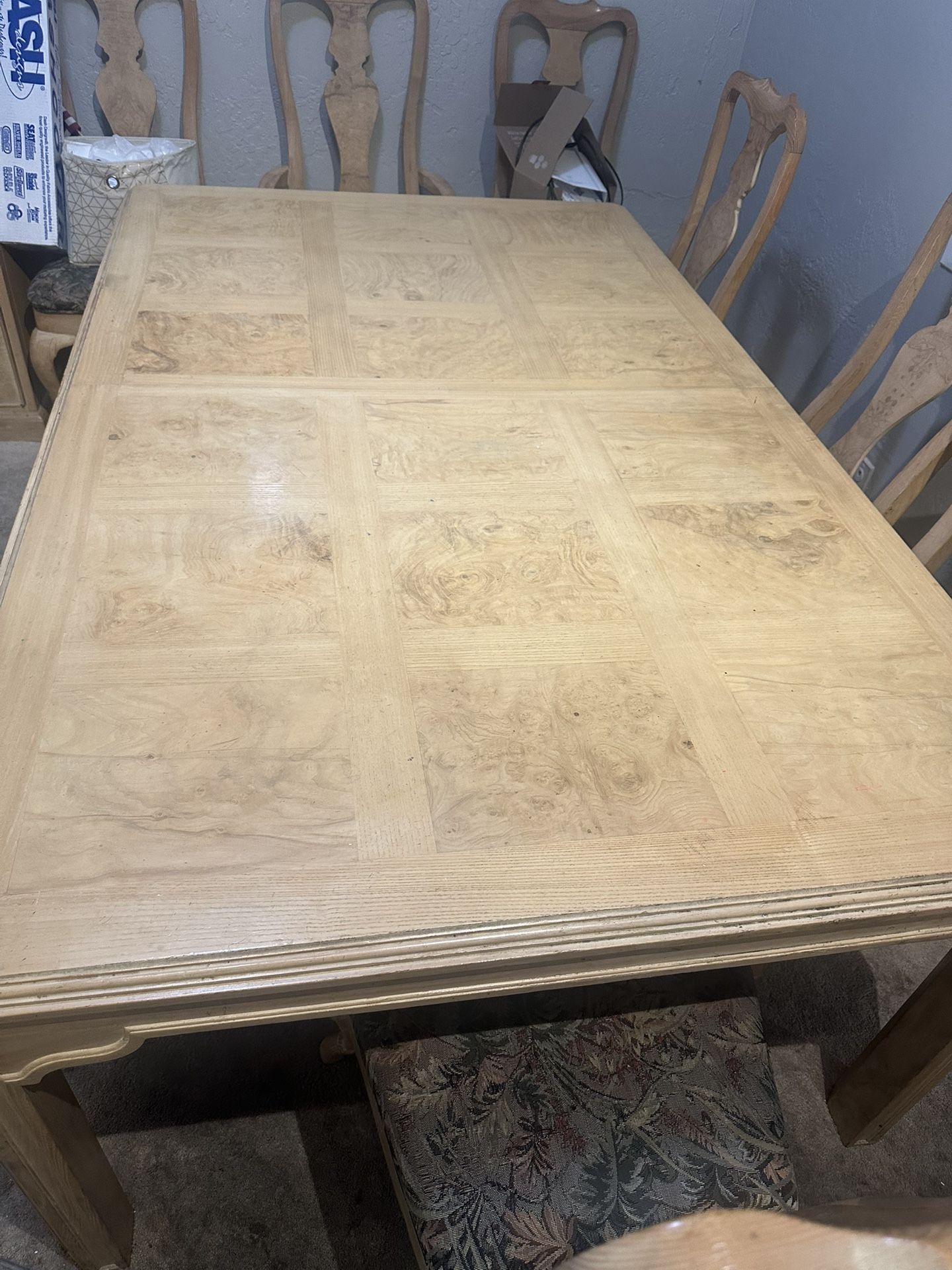 Dining room table. Comes with 6 chairs. The table expands to accommodate more people. Solid wood, very durable. Give me an offer.