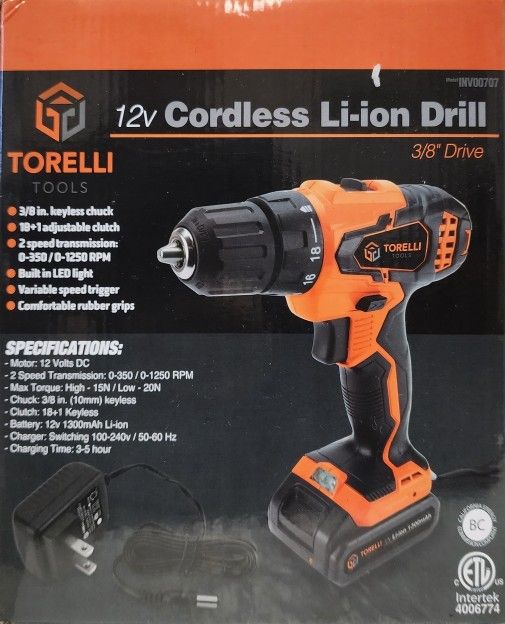 3/8 in. keyless chuck 18+-1adjustable clutch ○ 2speedtransmission: 0-350/0-1250RPM Buitin LED light Varieblespeed trigger Comfortable rubber grips 3/8" Drivll TOOLS SPECIFICATIONS: ⁃ Motor: 12 Volts DC - 2 Speed Transmission: 0-350 / 0-1250 RPM Max Torque: High- 15N /Low-20N ⁃ Chuck: 3/8 in. (10mm) keyless -Clutch: 18+1 Keyless Battery: 12v 1300mAh Li-ion Charger: Switching 100-240v / 50-60 Hz Charging Time: 3-5 hour