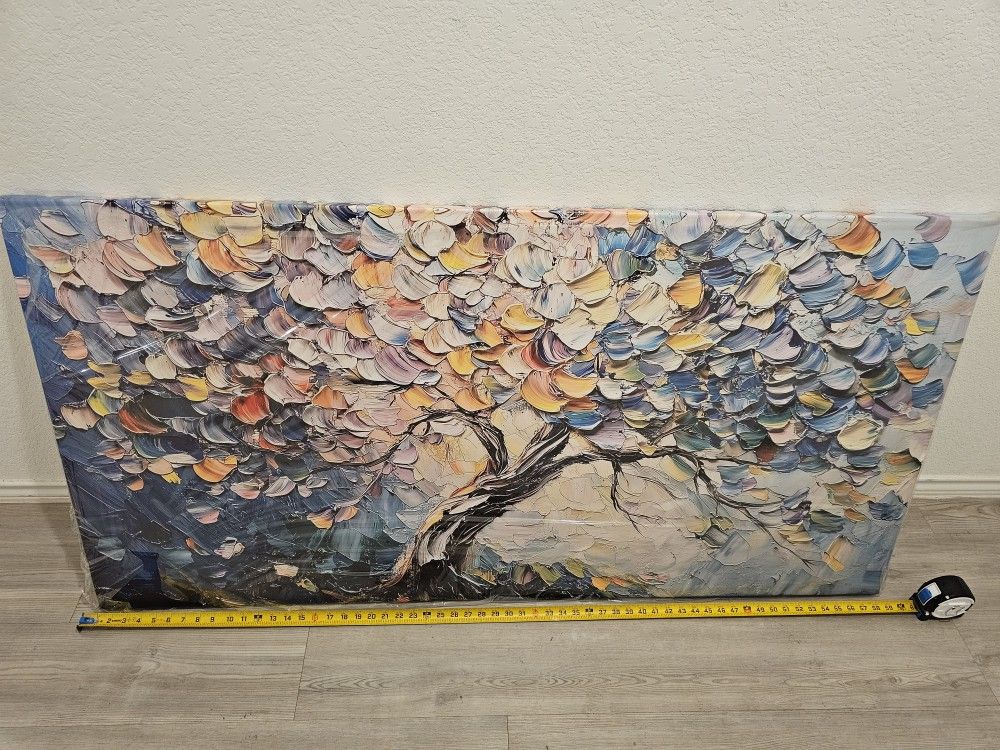 Transform your space with this explosion of color and texture. This oversized abstract piece uses heavy-impasto style brushwork to create a dynamic, multi-colored tree that breathes life into any modern interior. Vibrant Palette: A rich blend of blues, yellows, and pinks that complements various accent pillows and furniture. Grand Scale: At 29" x 59", this wide-format canvas is designed to be the centerpiece above a large sectional or in a spacious hallway. Contemporary Aesthetic: The abstract nature of the "leaves" provides a sophisticated, gallery-style look suitable for both home and professional office settings. Ready for Display: Lightweight and easy to mount for an instant room makeover....4666