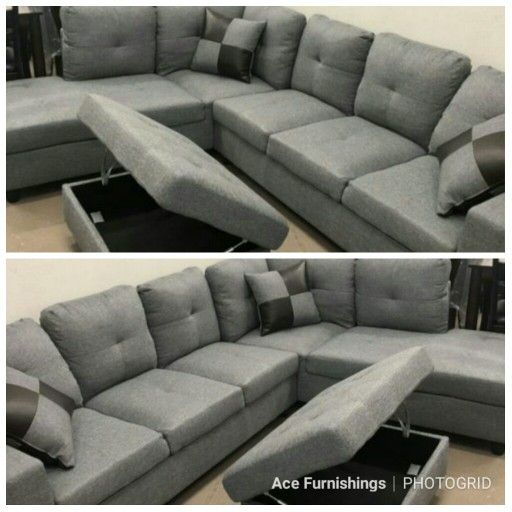 Brand New Gray Denim Linen Sectional With Storage Ottoman