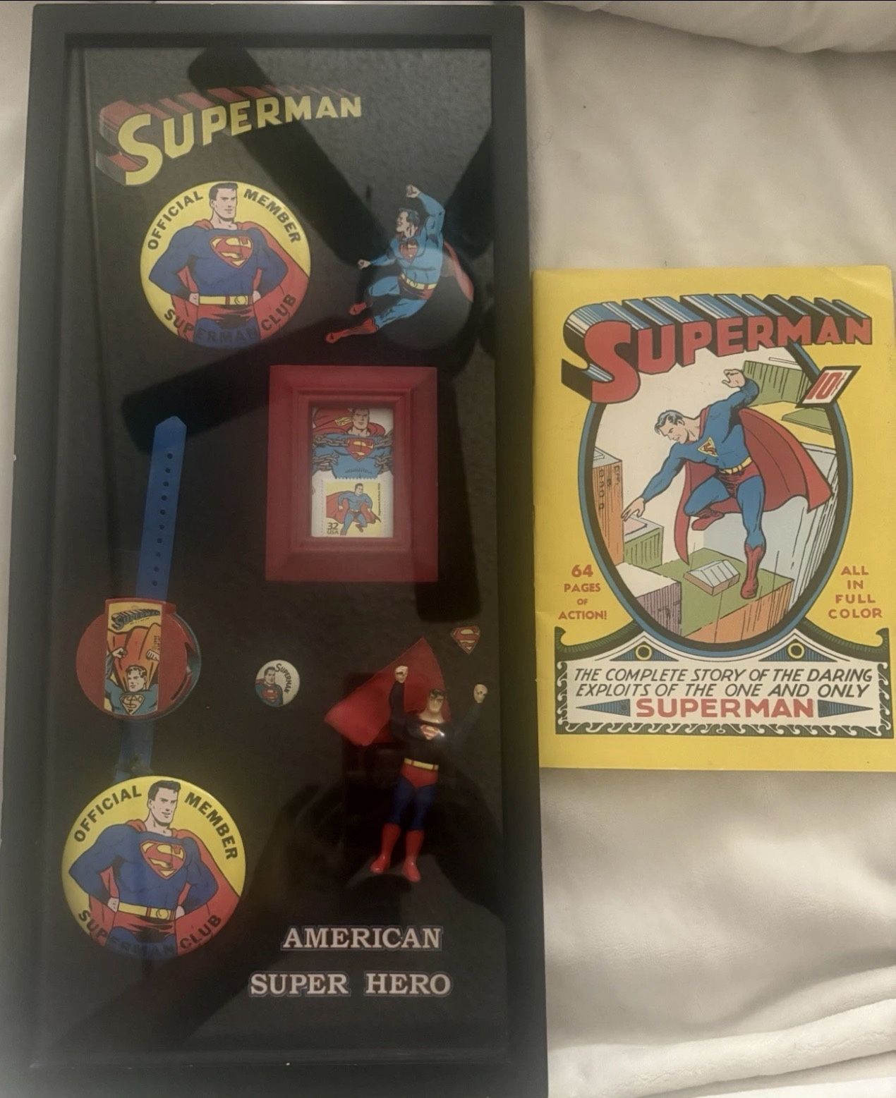 Shadow box with vtg 1960 buttons a stamp and figurine also included Superman comic reprint from 1999 in good condition must have for a Superman collector