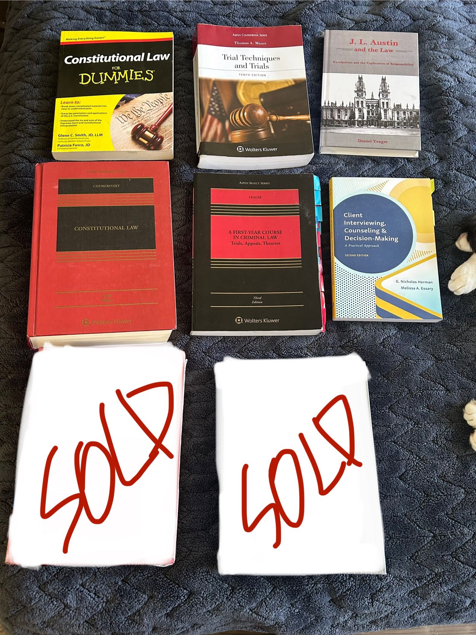 π Constitutional Law, Criminal, and Evidence β’ SOLD β Evidence β’ $120 β A First-Year Course in Criminal Law: Trials, Appeals, Theories (3rd, Like New) β’ SOLD β Constitutional Law β’ $50 β Constitutional Law (6th, Like New) β’ $10 β Constitutional Law For Dummies (Used) βΈ» π California Procedure β’ $70 β Civil Procedure: A Coursebook (4th, Used) β’ $30 β Cases and Materials on California Civil Procedure (5th, Like New) β’ $200 β Cases and Materials on California Civil Procedure (6th, Like New) β’ $50 (2 available) β Civil Procedure in California: State and Federal, 2021 (Used) β’ $5 β Civil Procedure: Rules, Statutes, and Other Materials, 2021 Supplement (Used) βΈ» π Probate, Wills, and Business β’ $10 β Business Associations: 2022 Statutory Supplement ISBN: (contact info removed)207 β’ $70 β Business Planning: Financing the Start-Up Business and Venture Capital Financing (3rd, Used) ISBN: (contact info removed)882152 β’ $150 β Business Organizations: An Integrated Approach (1st, Like New) ISBN: (contact info removed)288763 β’ $20 β California Probate Code 2022: Desktop Edition ISBN: (contact info removed)221555 β’ $50 β California Probate Code 2023: Desktop Edition ISBN: (contact info removed)986054 β’ $100 β California Probate Code 2024: Desktop Edition ISBN: (contact info removed)718407 β’ $200 β Wills, Trusts, and Estates (11th, NEW) ISBN: (contact info removed)824469 βΈ» π Property, Torts, and Energy β’ $150 β Community Property in California (8th, Like New) ISBN: (contact info removed)804409 β’ $50 (2 available) β Property (9th, Used) ISBN: (contact info removed)881995 β’ $100 β Prosser, Wade and Schwartzβs Torts, Cases and Materials (4th, Like New) ISBN: (contact info removed)674077 β’ $80 β Torts: Cases and Questions (3rd, Like New) ISBN: (contact info removed)892748 β’ $30 β Examples & Explanations for The Law of Torts (6th, Like New) ISBN: (contact info removed)807691 β’ $30 β Understanding Torts (7th, Like New) ISBN: (contact info removed)023430 β’ $30 β Understanding Modern Real Estate Transactions (4th, Like New) ISBN: (contact info removed)006976 β’ $20 β Energy Law (Concepts and Insights) (2nd, Like New) ISBN: (contact info removed)425345 βΈ» π Ethics, Immigration, and Labor β’ $10 β Legal Ethics: Rules, Statutes, and Comparisons (2019, Used) ISBN: (contact info removed)014766 β’ $50 β Legal Ethics: Rules, Statutes, and Comparisons (2023, Like New) ISBN: (contact info removed)020620 β’ $40 β California Legal Ethics (11th, Like New) ISBN: (contact info removed)082611 β’ $200 β Immigration and Citizenship: Process and Policy (9th, Like New) ISBN: (contact info removed)677504 β’ $50 β Cox and Bokβs Labor Law (16th, Like New) ISBN: (contact info removed)101515 βΈ» π Everything Else β’ $20 (2 available) β The Legal Writing Handbook: Analysis, Research, and Writing (8th, Like New) ISBN: (contact info removed)830415 β’ $5 β Legal Writing in Plain English: A Text With Exercises (1st, Like New) ISBN: (contact info removed)284187 β’ $10 β Legal Analysis: The Fundamental Skill (3rd, New) ISBN: (contact info removed)011970 β’ $50 β J.L. Austin and the Law: Exculpation and the Explication of Responsibility (NEW, Daniel Yeager) ISBN: (contact info removed)482331 β’ $20 β Client Interviewing, Counseling, and Decision-Making: A Practical Approach (2nd, Like New) ISBN: (contact info removed)017910 β’ $10 β Writing for the Legal Audience (2nd, NEW) ISBN: (contact info removed)633917 β’ $10 (2 available) β Plain English for Lawyers (6th, Like New) ISBN: (contact info removed)006990 β’ $20 β Typography for Lawyers (2nd, Like New) ISBN: (contact info removed)392623 β’ $5 β On Writing: A Memoir of the Craft by Stephen King (Used) ISBN: (contact info removed)159375 β’ $10 β The Elements of Style, 15th Anniversary Edition (New) ISBN: (contact info removed)632640 β’ $5 β Dreyerβs English: An Utterly Correct Guide to Clarity and Style (Used) ISBN: (contact info removed)985719 β’ $30 β The Bluebook: A Uniform System of Citation (21st, Used) ISBN: (contact info removed)666150 β’ $30 β Bryan A. Garnerβs Redbook: A Manual on Legal Style (4th, Used) ISBN: (contact info removed)421002 β’ $50 β Trial Techniques and Trials (10th, Like New) ISBN: (contact info removed)886532