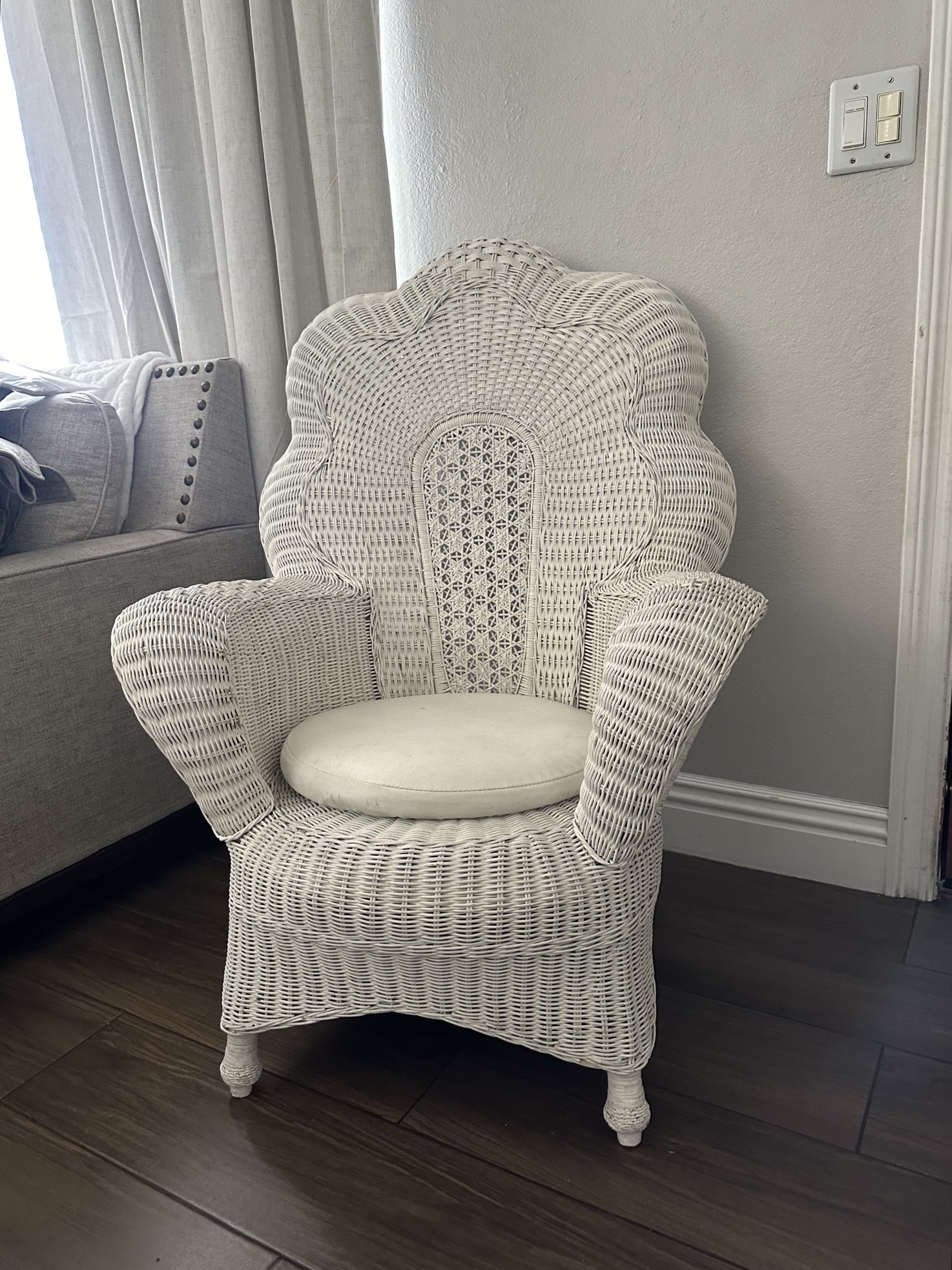 Wicker chair Comes with cushion No breaks or cracks in the chair Always kept indoors! Paid over $300+ brand new for it.